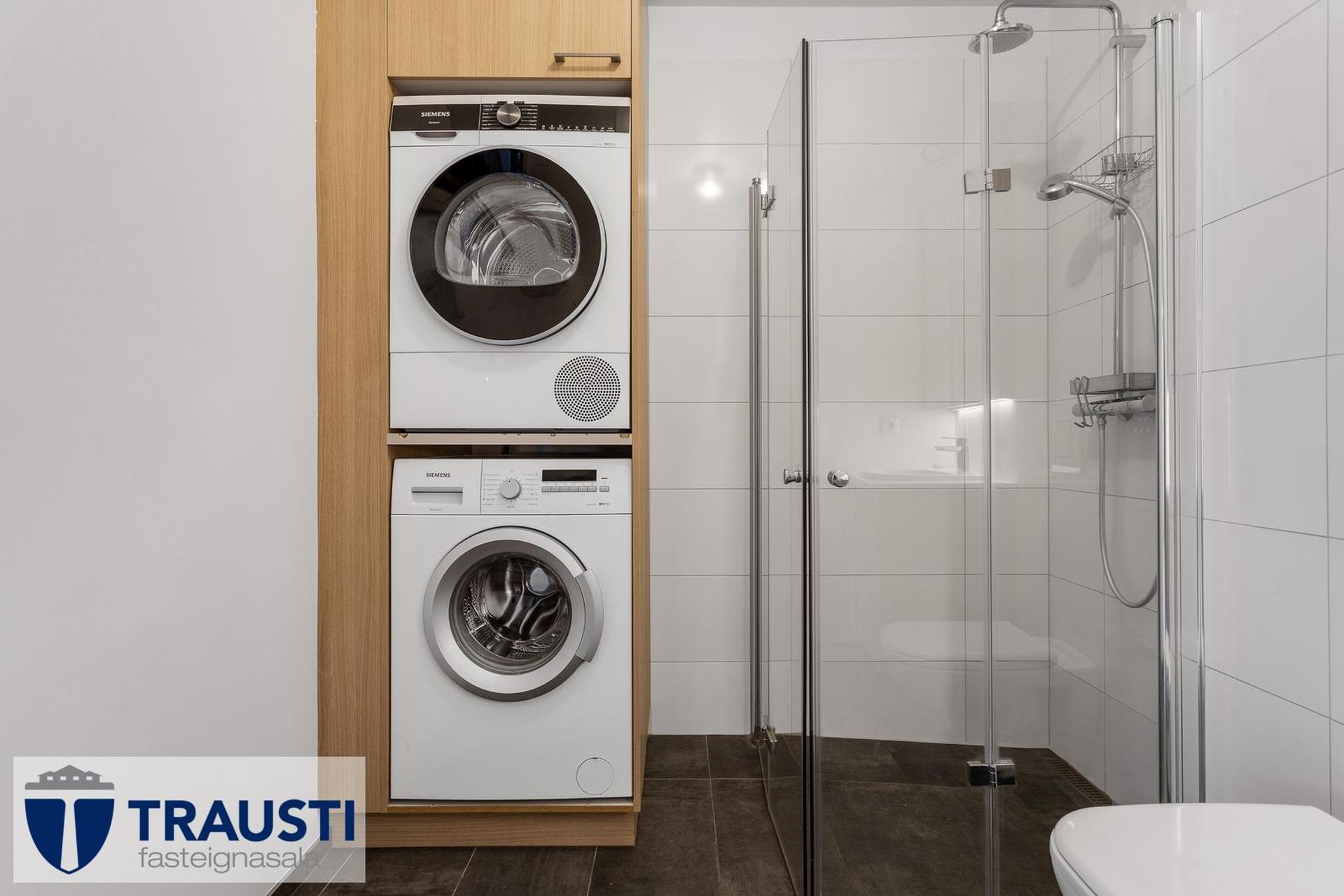 Baðherbergi er með snyrtilegri innréttingu, upphengt salerni, sturta með glerskilrúmi og flísar á gólfi og að hluta til veggjum. Innrétting fyrir þvottavél og þurrkara með skápum yfir vélum.