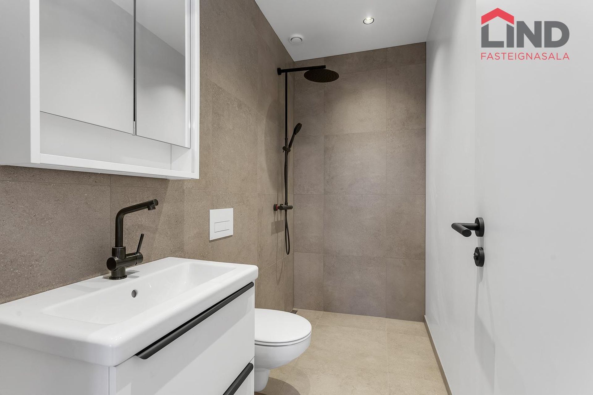 Baðherbergi I: Með flísum á gólfi og hluta veggja. Flísalögð sturta með gleriþili, upphengt salerni og góð innrétting við vask. Vélræn útloftun.