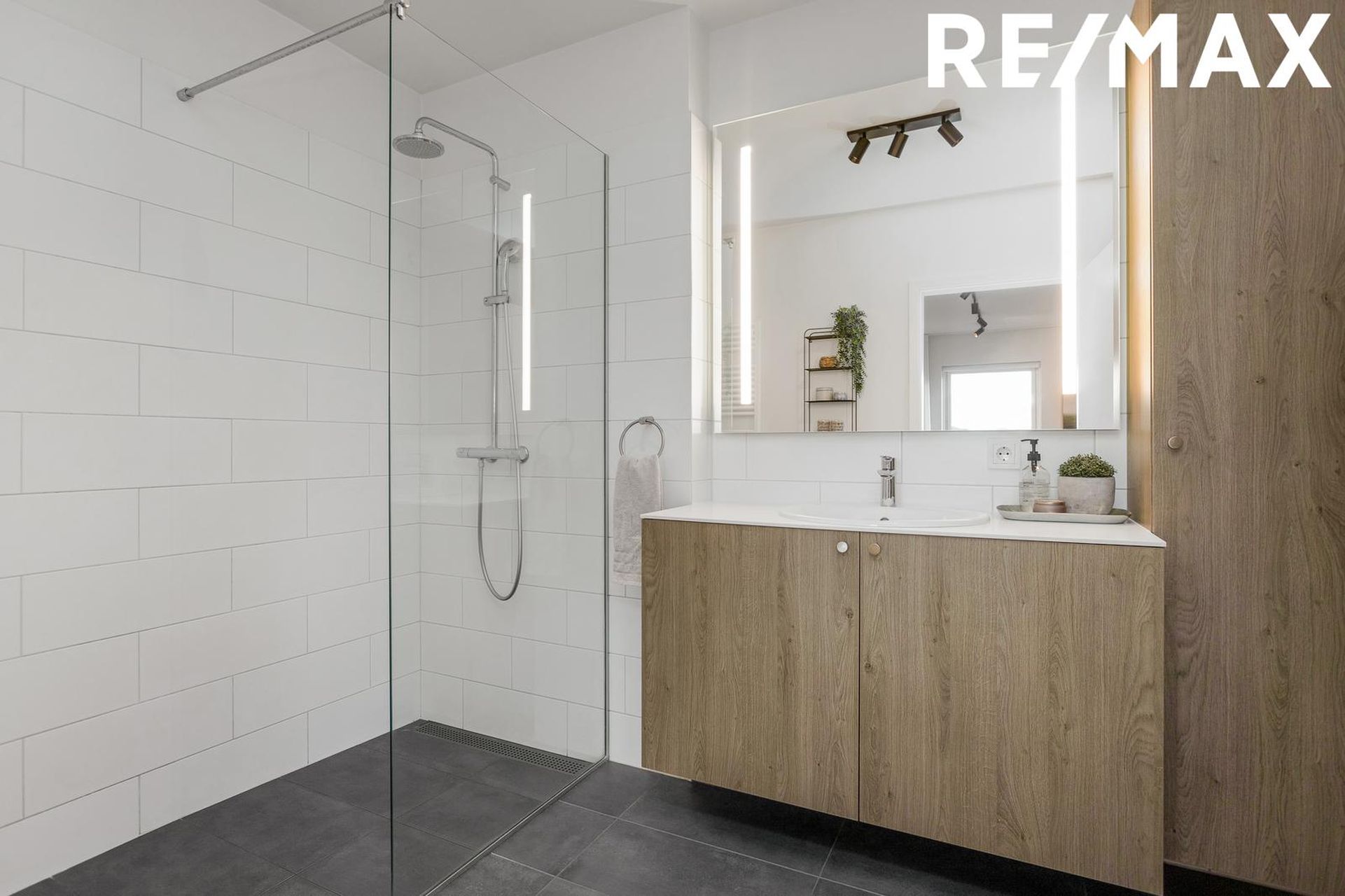 Baðherbergi er með flíslagt gólf og vegg að hluta. Falleg og stílhrein innrétting frá Formus. Spegill með innbyggðri lýsingu. Sturta er með hertu gleri og handklæðaofn. Salerni er vegghengt með vatnssparandi þrýstirofa, handlaug er í borði innréttingar með einnar handar blöndunartæki. Hitastýrð einnar handar blöndunartæki eru í sturtu. Tengi er fyrir þvottavél og þurrkara inn á baðherbergi með innréttingu og góðum skáp fyrir ofan.