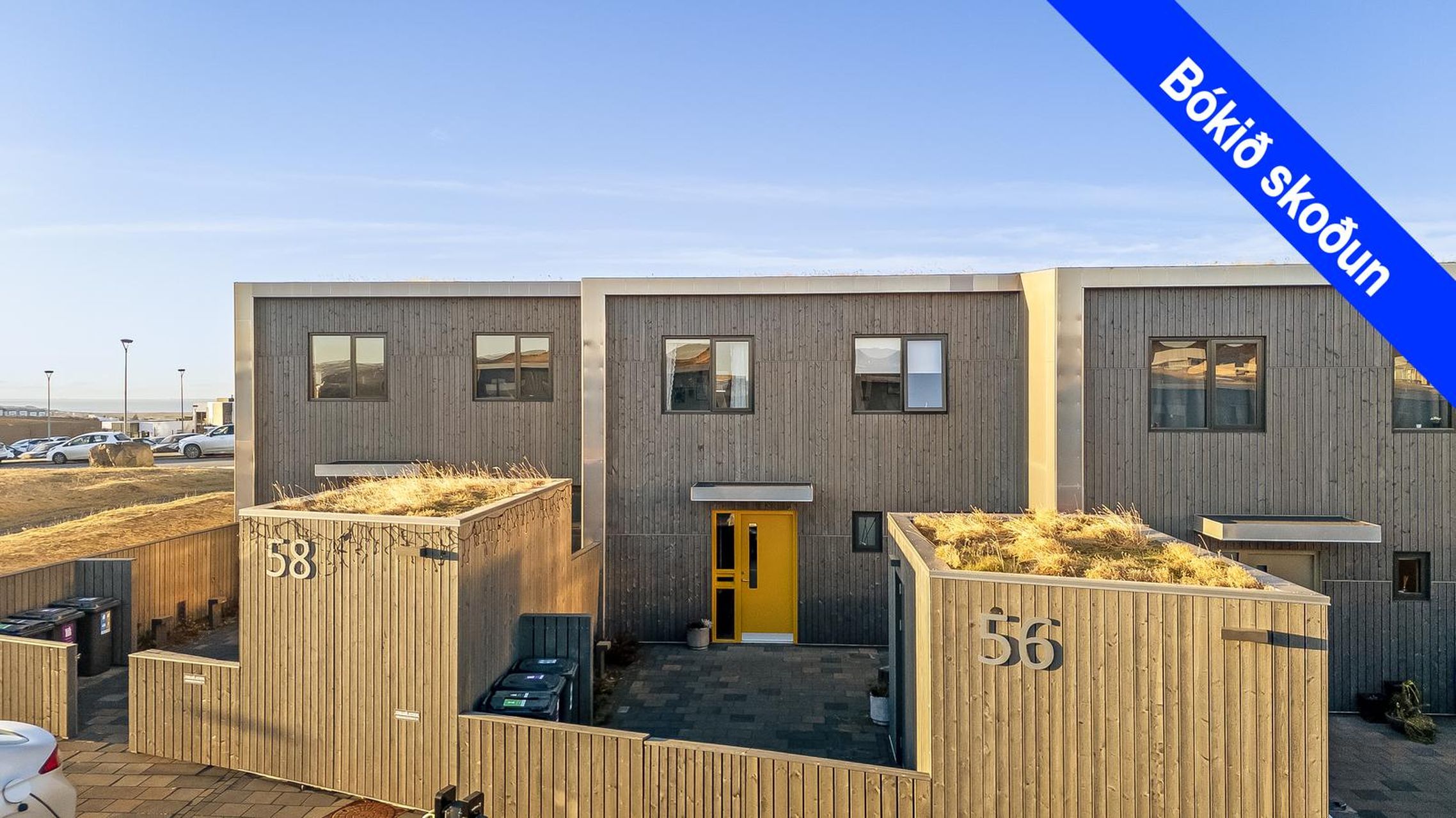 Tvö sérbílastæði, hleðslustöð og upphituð 12 fm geymsla fyrir framan húsið.