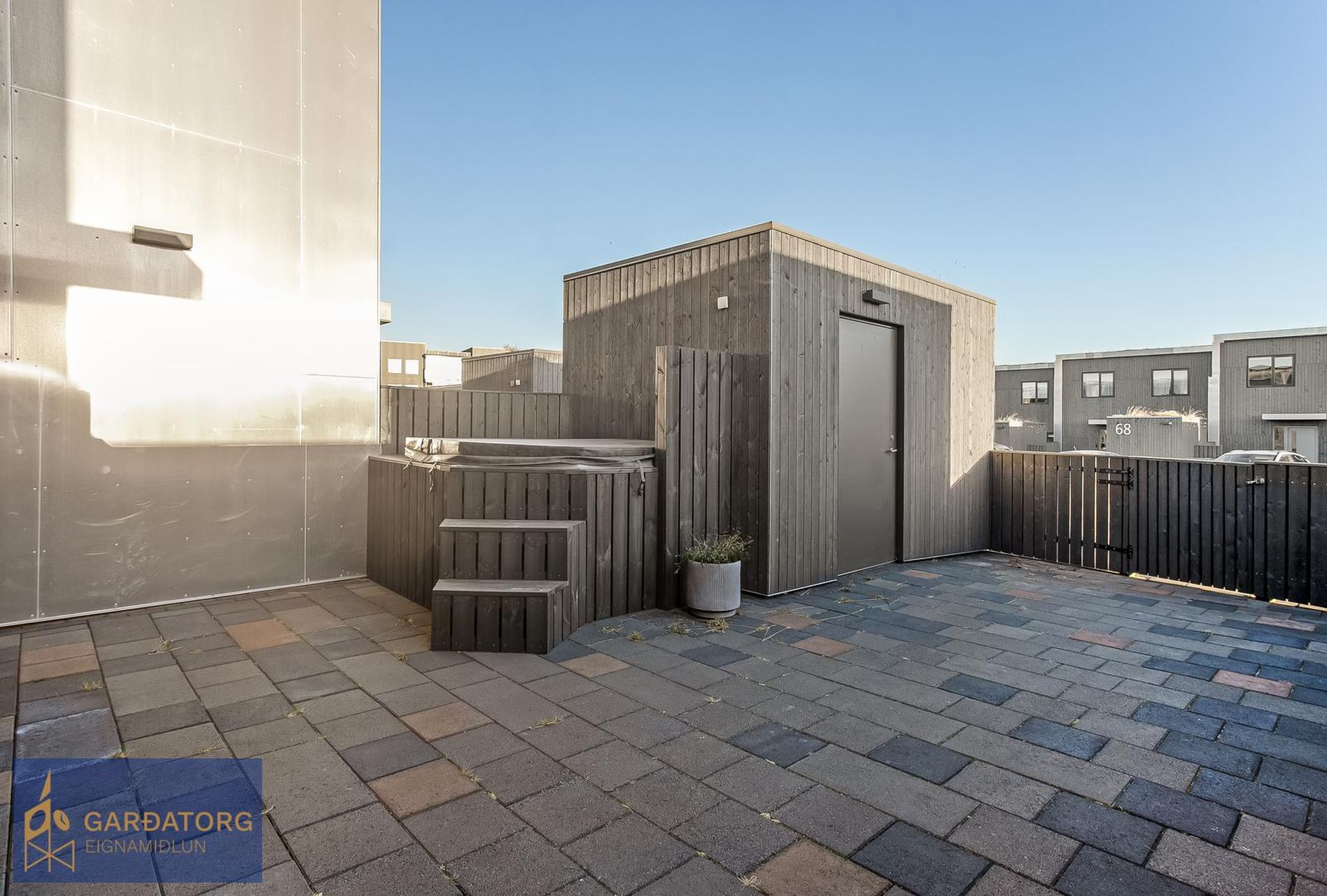 Hellulögð verönd með snjóbræðslu og heitum potti.
