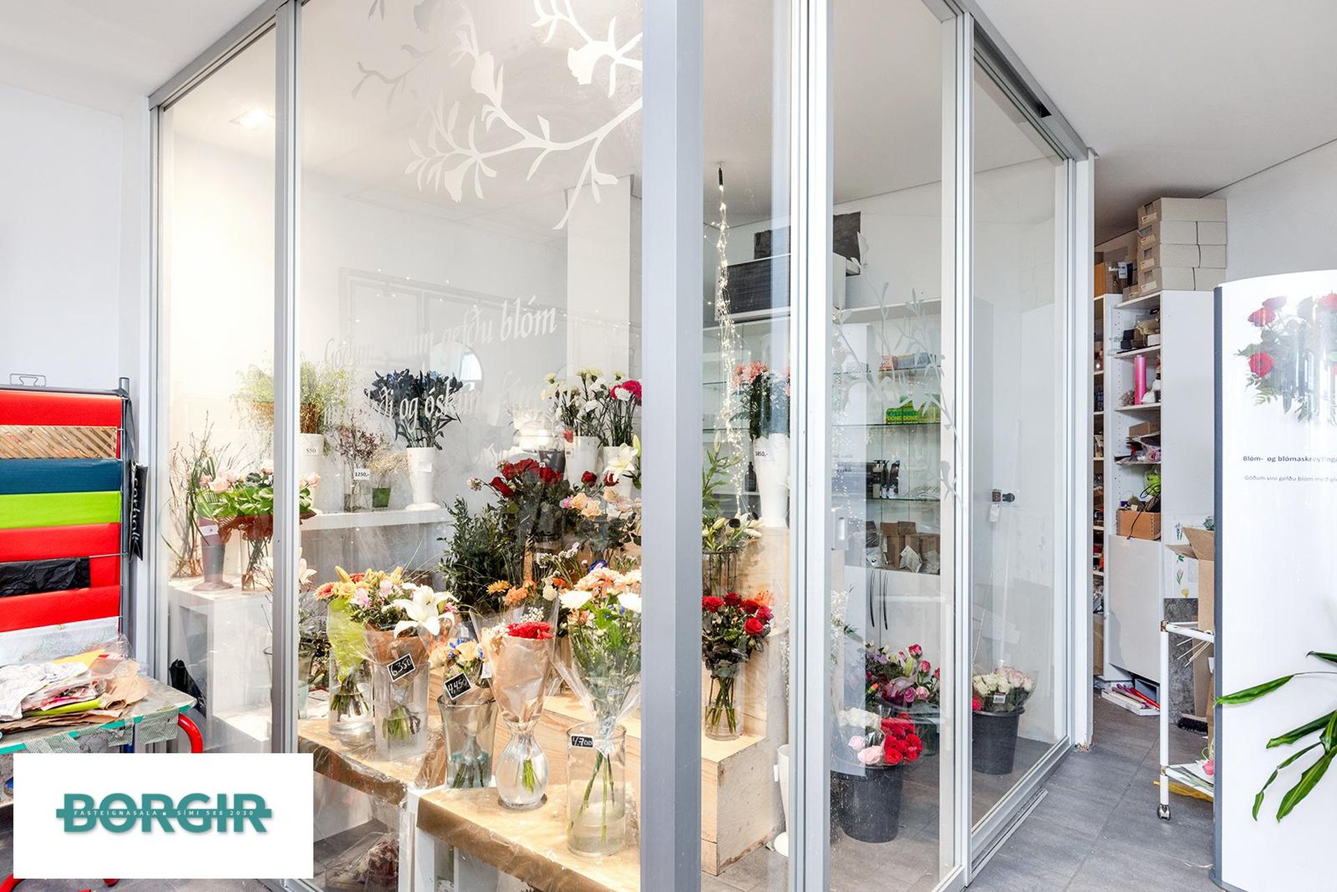 Um er að ræða bjart og opið verslunar- skrifstofuhúsnæði á jarðhæð miðsvæðis á Akranesi. Húsnæðið er með gólfsíðum álgluggum og hátt til lofts. Gluggarnir eru opnaðir að innan með rafmagnsstýringu. Í loftunum er bæði gifs- og kerfisloft með led lýsingu að hluta og hallogen lýsingu að hluta og því mjög auðvelt að breyta lýsingu. Mjög auðvelt er að skipta húsnæðinu upp í fleiri hluta en í dag er þar starfrækt blóma- og gjafavöruverslun og því er sér kælir fyrir blómin. Innaf versluninni er kaffiaðstaða, salerni, lager með manngengnu háalofti og skrifstofa. Á gólfunum er steinteppi en flísar á blómasvæðinu, blómaakæli og á lagernum. Hiti er í öllu gólfinu. Næg bílastæði eru fyrir framan húsnæðið.