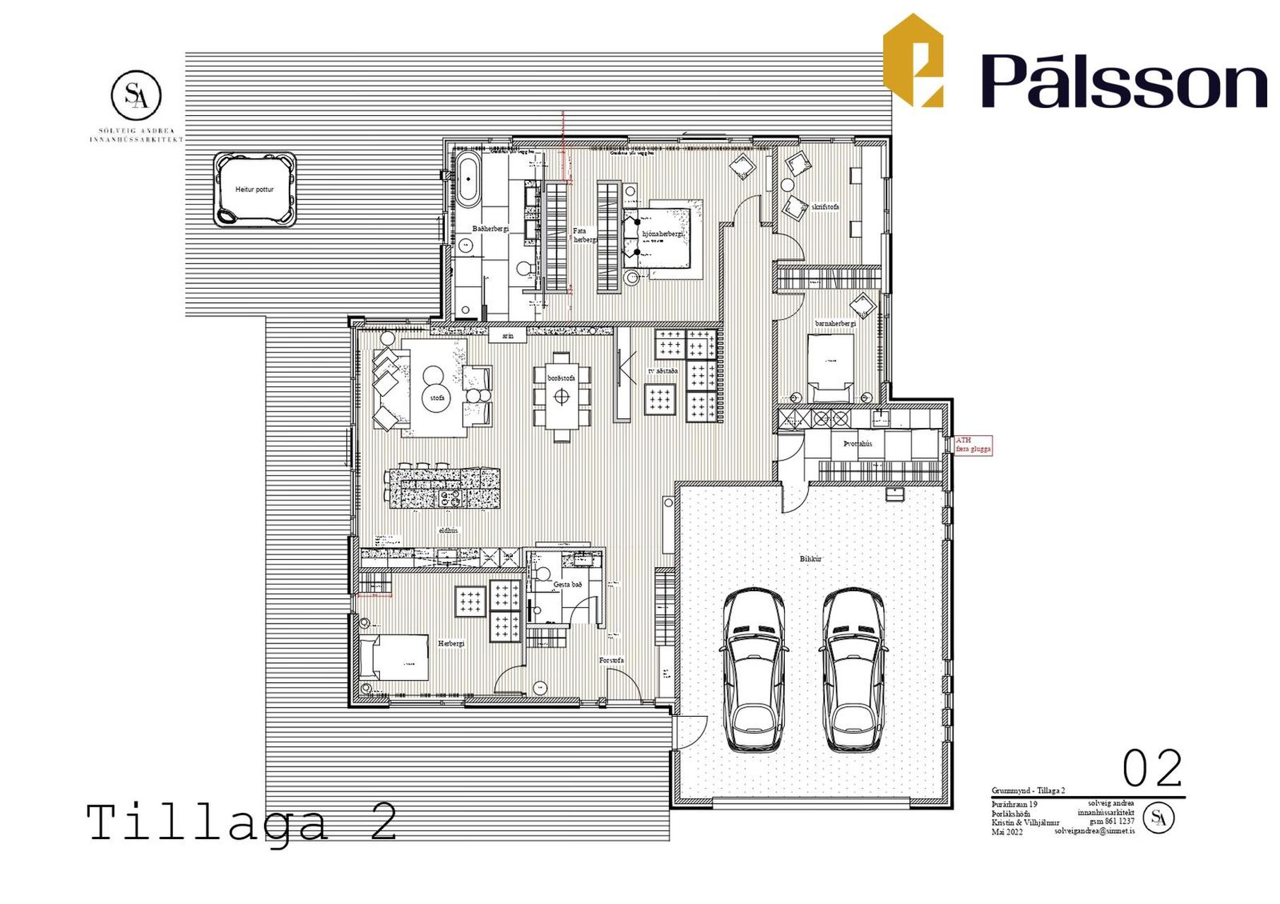 Samkvæmt teikningum ( sjá tillögu 1) skiptist eignin í forstofu, eldhús, stofu, borðstofu og sjónvarpshol í rúmgóðu alrými þaðan sem útgengt er um rennihurð út á sólpall sem nær í þrjár áttir við húsið, 4 svefnherbergi( þar með talið hjónasvítu með fataherbergi), 2 baðherbergi, þvottahús og tvöfaldan bílskúr.