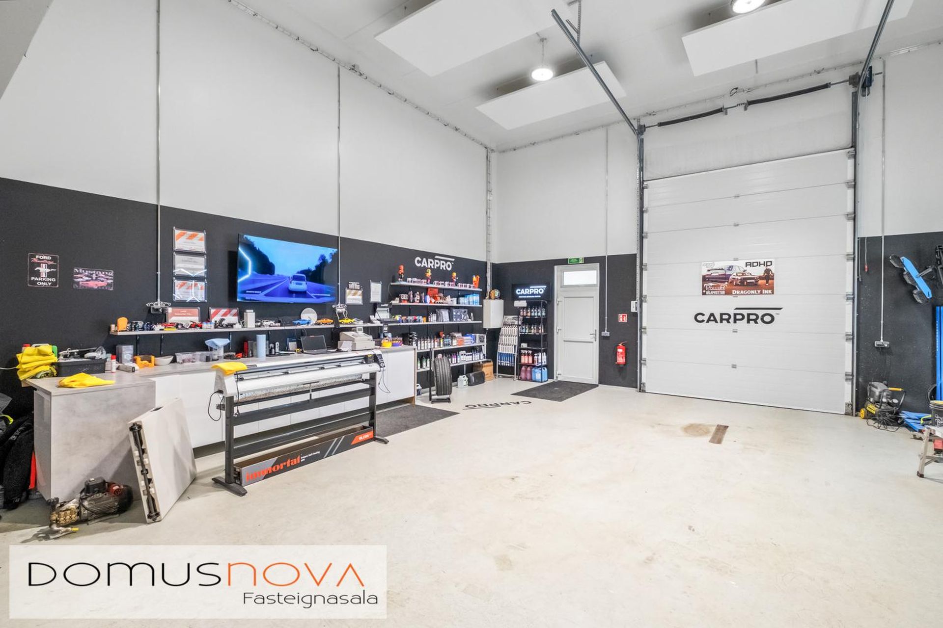 Á neðri hæð er 96 fm. salur með stórum (4,0 X 2,5) metra innkeyrsludyrum og göngudyrum bæði að framan og aftan. Lofthæð í þessum hluta er ca. 6 metrar.