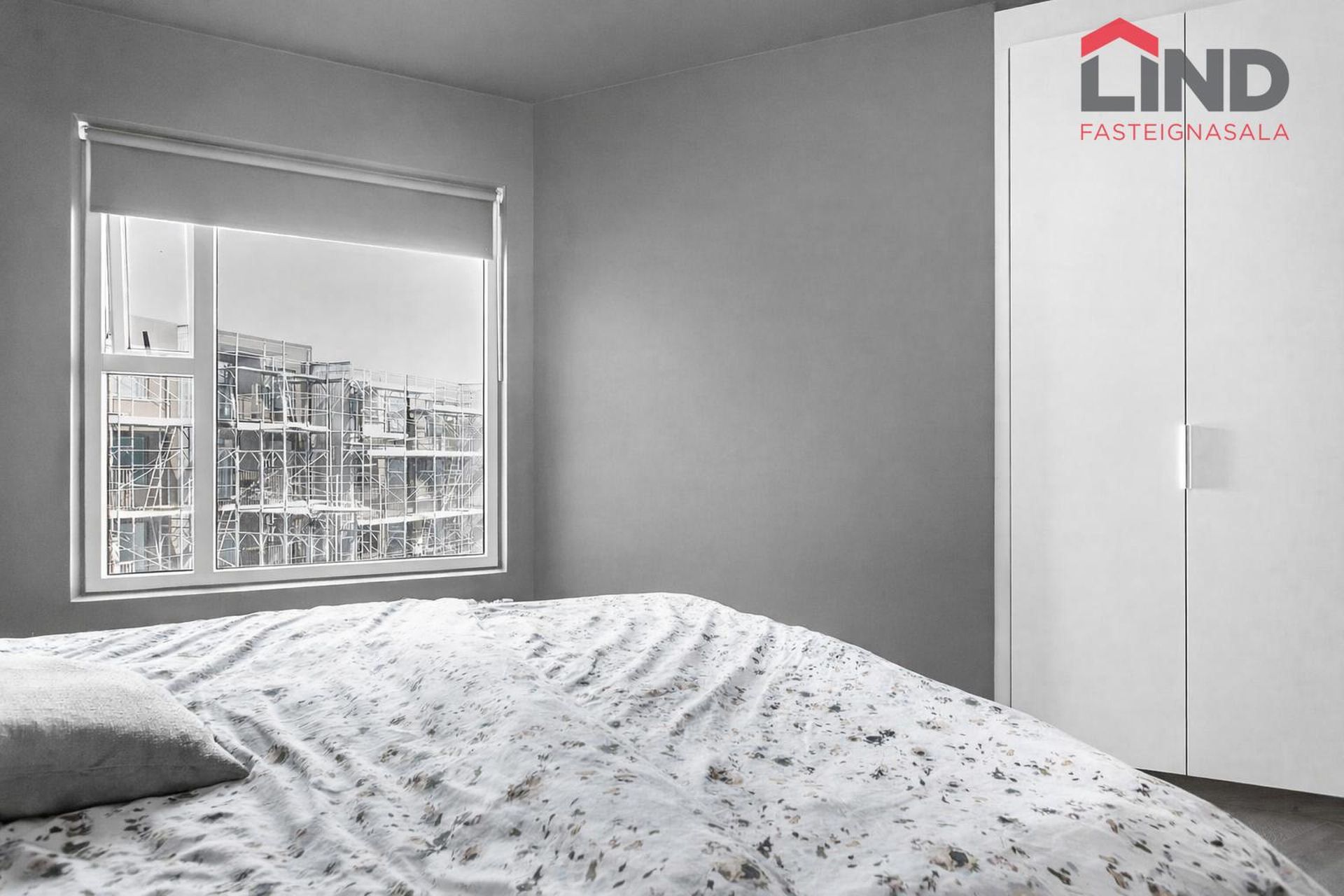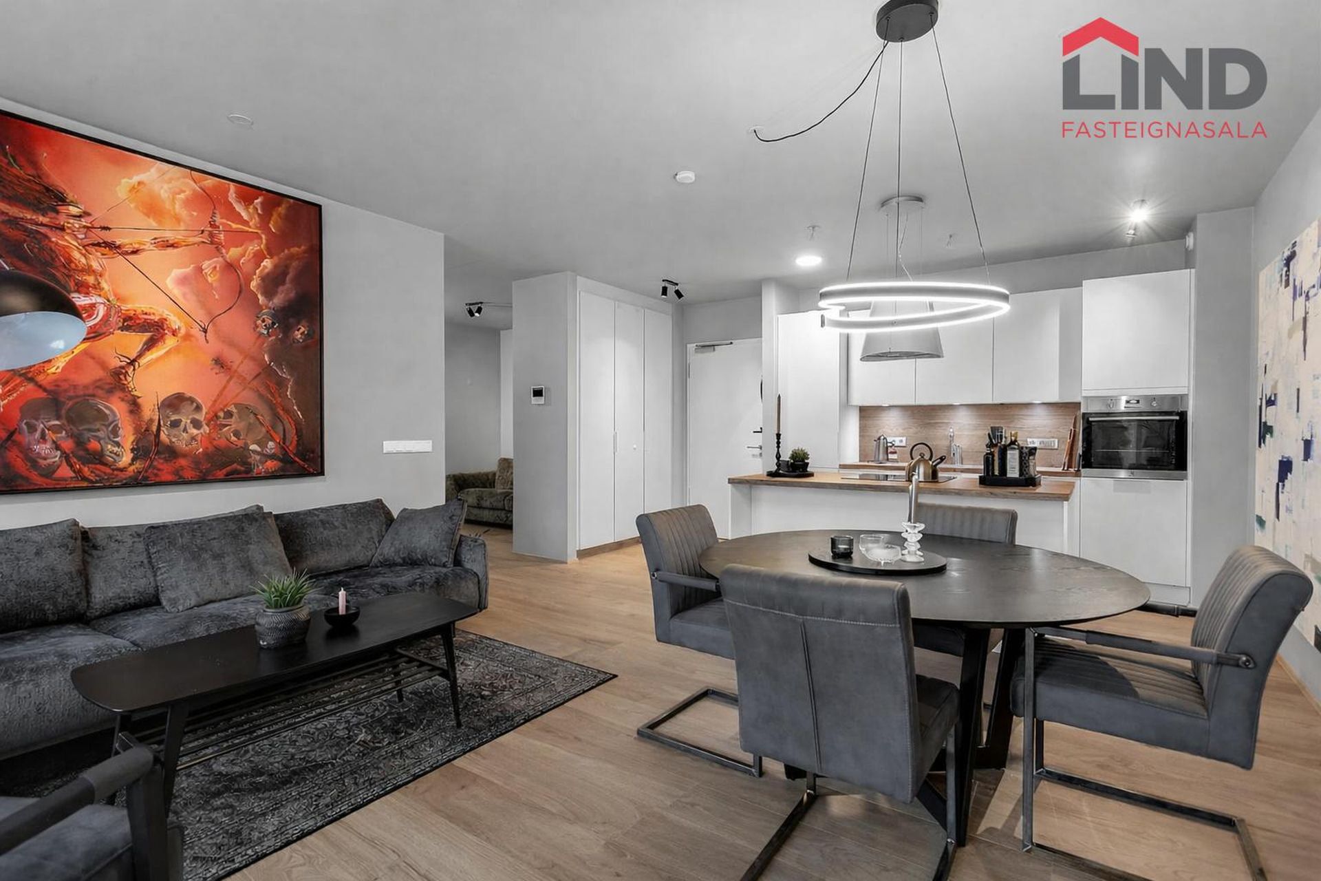 Rúmgott alrými sem er opin stofa við eldhús og auk þess er sér sjónvarpsstofa fyrir miðri íbúð. Sér bílastæði í lokuðum bílakjallara á góðum stað. Útgengi úr stofu á svalir með fallegu útsýni sem snúa inn í fallegan bakgarð sem er tyrfður lyngtorfi, garðbekkjum, kvöldlýsingu og leiktækjum. Gott þvottaherbergi inn af íbúð. Rúmgóð 9,8 fermetra sérgeymsla á jarðhæð og sameiginleg hjóla- og vagnageymsla.