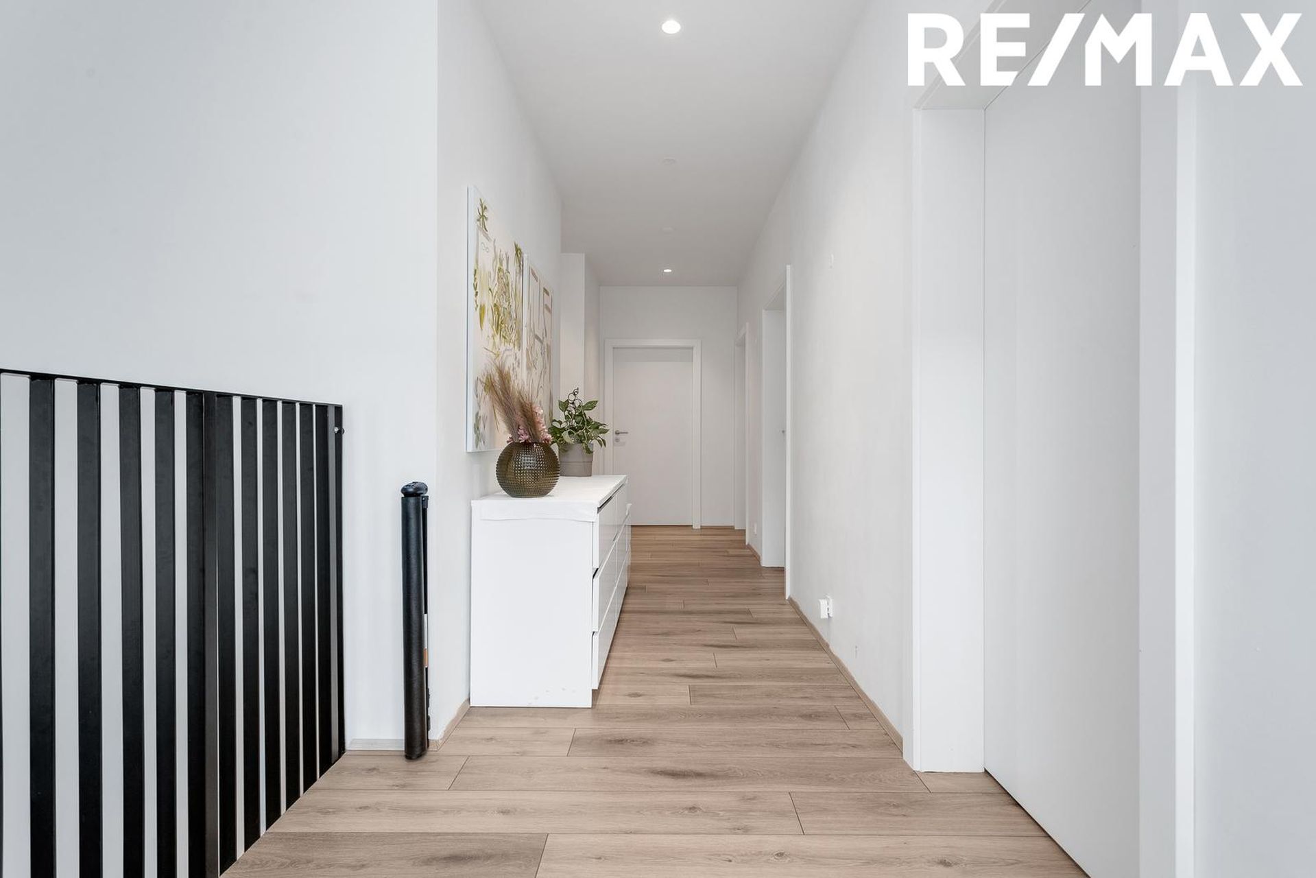 Þegar komið er upp á efri hæðina er komið inn á gang með fallegu harðparketi á gólfi sem liggur í L inn að alrými eignarinnar: Við ganginn eru þrjú af fjórum svefnherbergjum íbúðarinnar ásamt baðherbergi með þvottaaðstöðu.