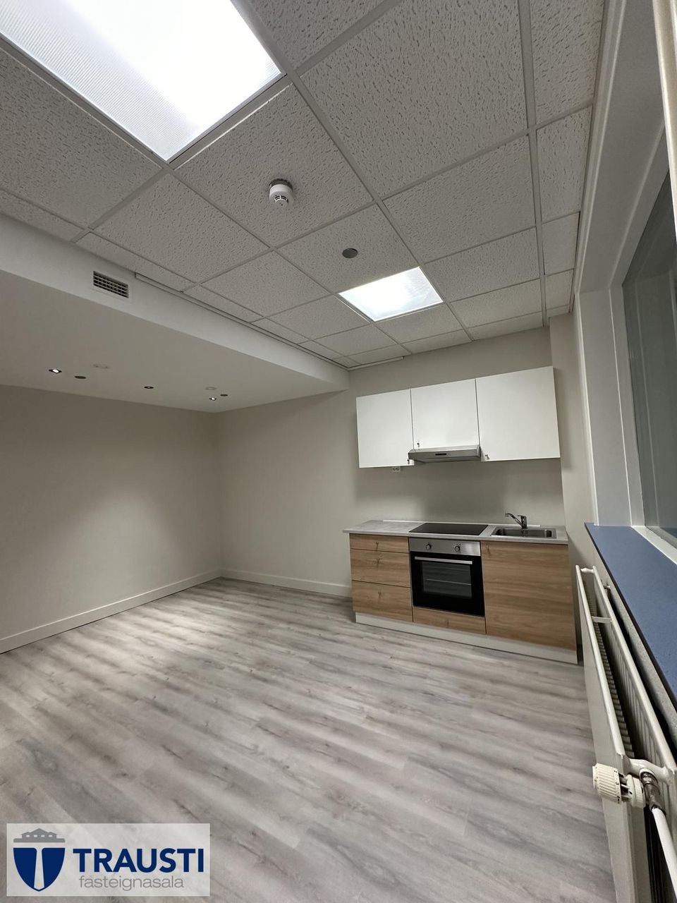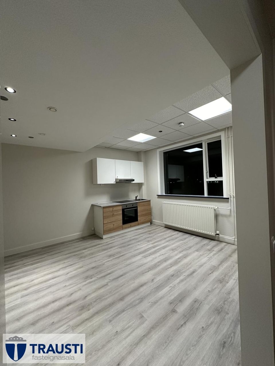 Eldhús og stofa í opnu rými, nýleg eldhúsinnrétting, nýlegt helluborð, nýlegur ofn, nýlegur gufugleypir og nýlegt parket á gólfi.