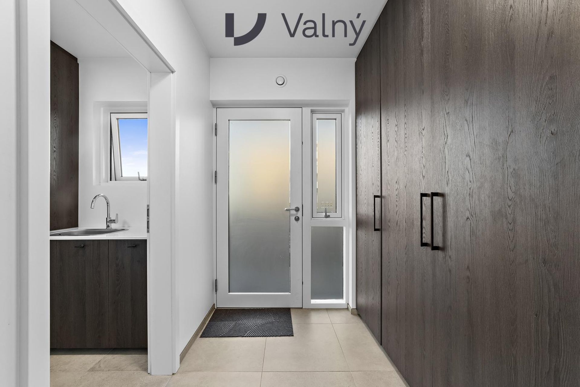 Þvottahús innaf forstofu með innréttingu fyrir vélar í vinnuhæð og skolvaski. Flísalagt gólf.