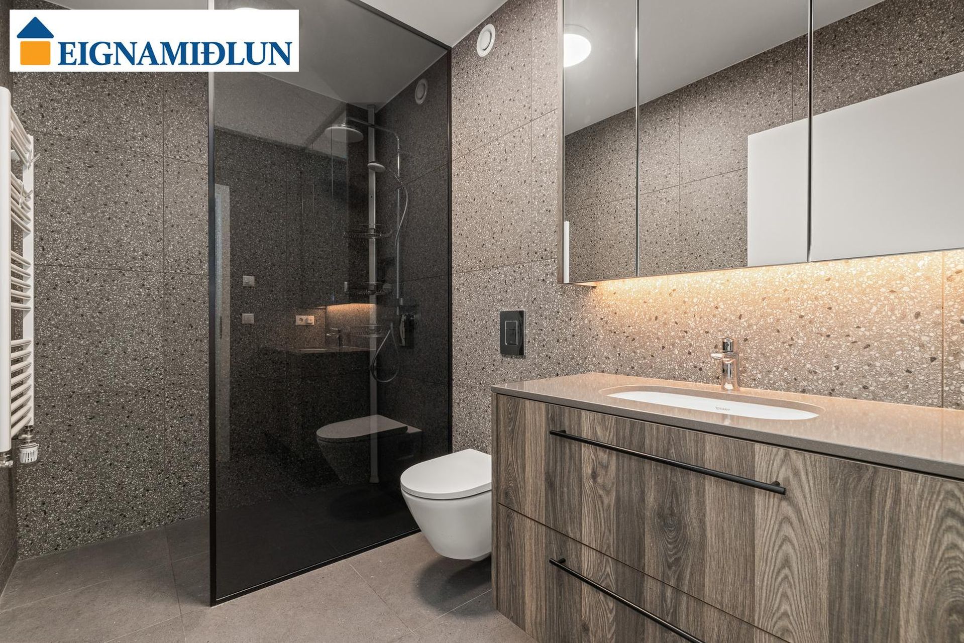 Baðherbergi: Mjög glæsilegt, flísalagt í hólf og gólf með stórum, ítölskum terrazzo flísum. Innréttingin er sérsmíðuð úr reyktri eik með kvartsstein á borðplötu og undirlímdum vaski. Sturtan er rúmgóð (walk-in) með blöndunartækjum frá Gröhe og reyklituðu sturtugleri sem nær alla leið upp í loft.