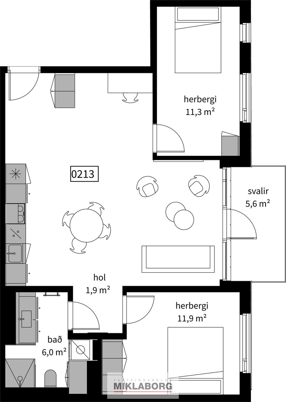 Íbúð 213 er 3ja herbergja íbúð á 2. hæð í Sunnusmára 2, með stæði í bílgeymslu.