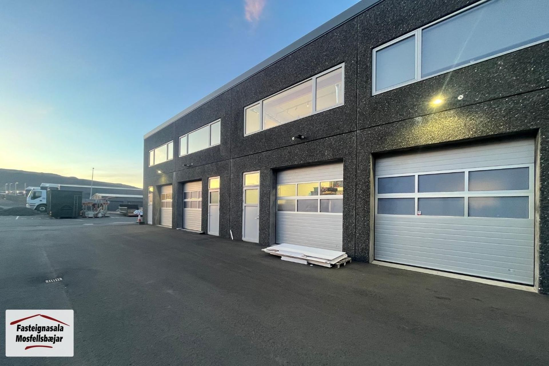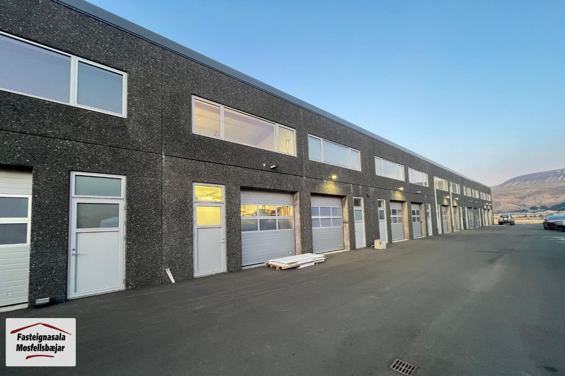 Nánar um húsið: Útveggjaeiningar eru frá Smellinn samlokueiningar með VÖLUN að utanverðu, veðurkáða 7 sm, einangrun 10 sm og burðarveggur 15 sm. Þakið eru yleiningar (Sandwich) og límtré. Annarhver milliveggur milli bila eru steinsteyptar einingar og annarhver er yleiningar. Yfirborð steyptra veggja að innan er grófpússað eða ómeðhöndlaðir úr steypumótum frá Smellin. Yfirborð yleiningar er lakkað málmyfirborð. Bílaplan er fullfrágengið malbikuð/hellulögð með niðurföllum, olíuskilju og sorpaðstöðu.