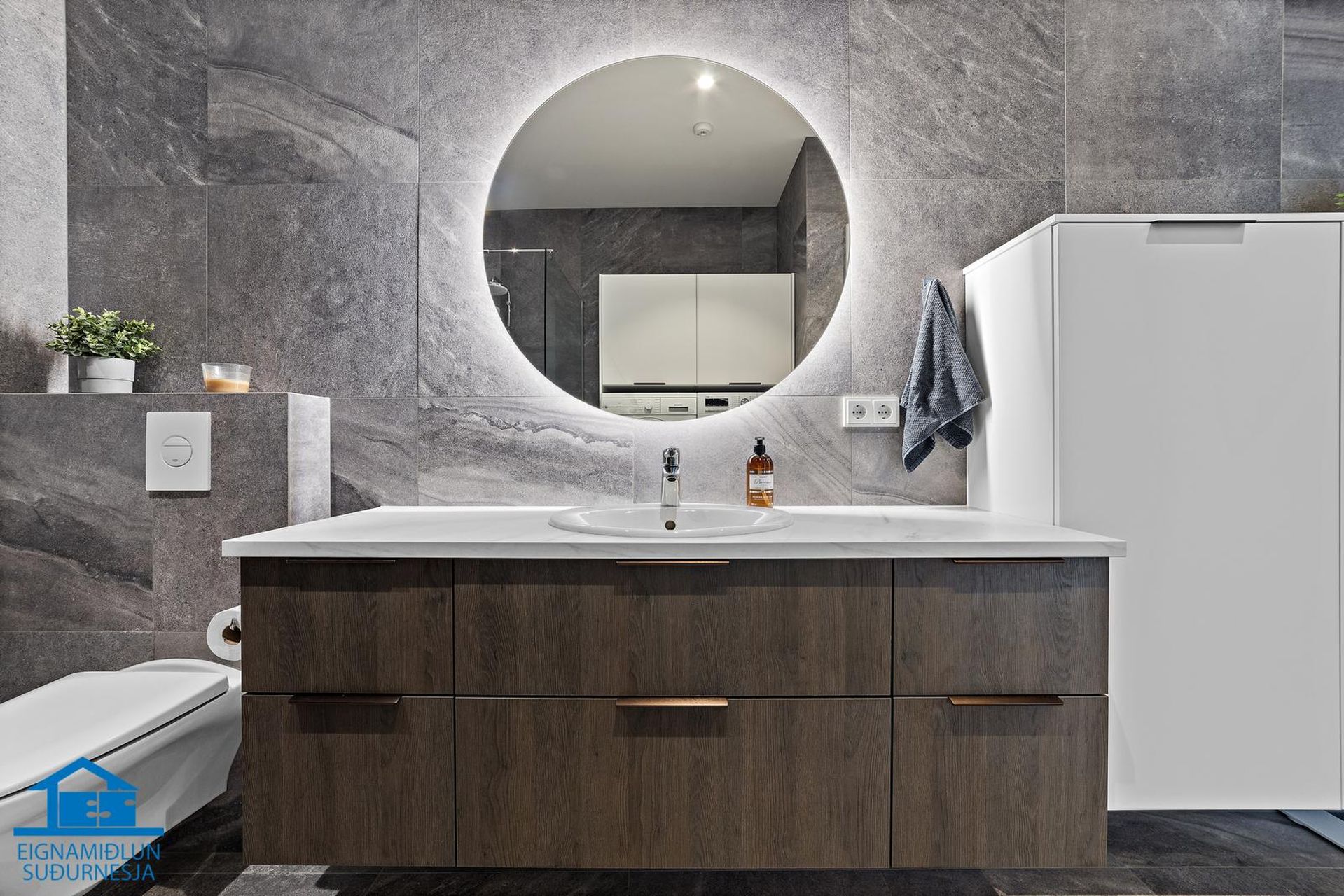 Baðherbergi hefur flísar á gólfi og veggjum, sturta, snyrtileg innrétting og aðstaða fyrir þvottavél og þurrkara í vinnuhæð ásamt miklu skápaplássi.