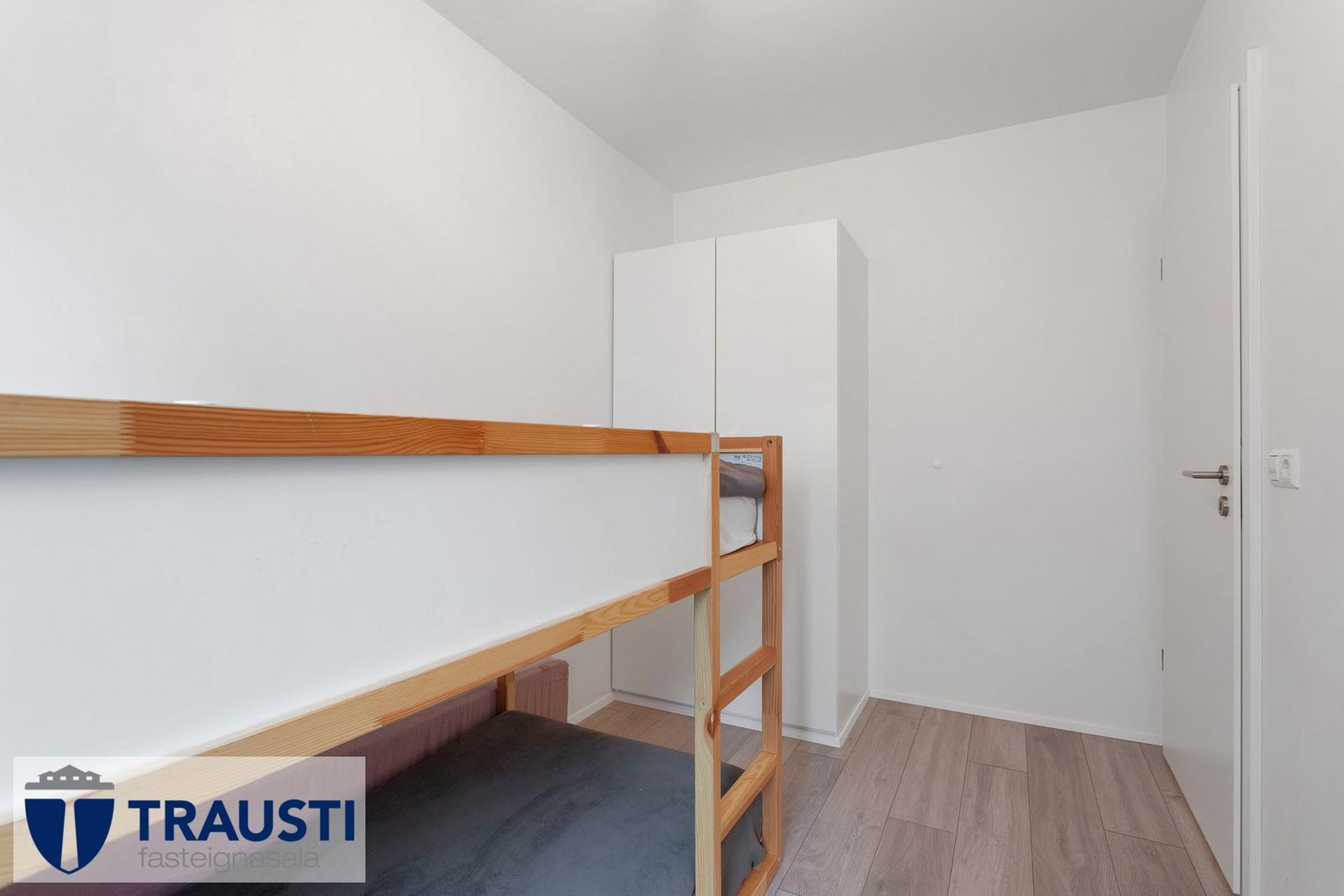Barnaherbergi er með fataskáp og parket á gólfi.