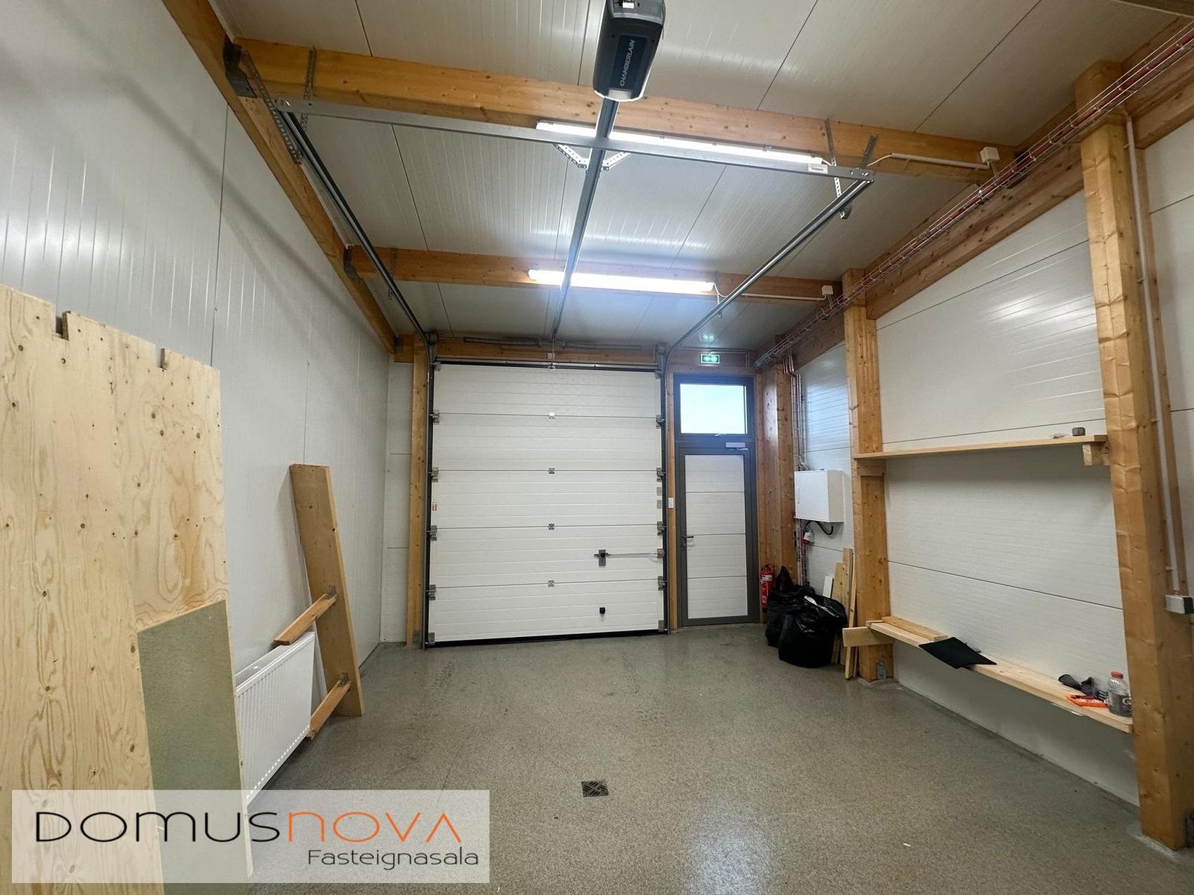 Rafmagnsmótor á innkeyrsluhurð með fjarstýringu. Innkeyrsluhurð er 3 metra há og inngönguhurð við hlið hennar fyrir hvert bil.