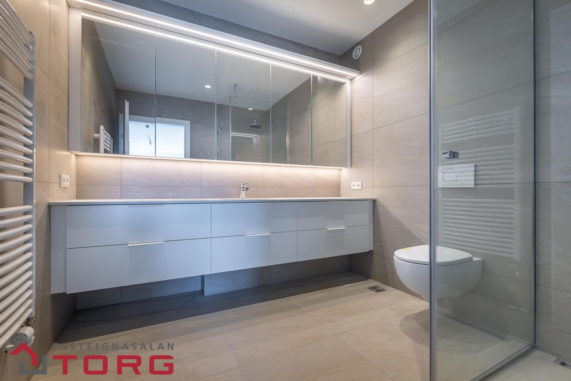 1.8. Baðherbergi Á baðherbergi er gólf flísalagt og verða veggir flísalagðir upp í loft. Innrétting frá Brúnás verður að innan úr ljósgráum spónaplötum, en sýnilegar hliðar og hurðir verða sprautulakkaðar. Borðplötur eru úr Virgo Quartz steini. Á baðherbergi verða ýmist speglaskápar eða speglar eftir því sem við á. Handlaug ásamt hitastýrðu blöndunartæki verður í innréttingu eftir því sem við á frá Tengi. Handklæðaofn þar sem við á, upphengt og innbyggt salerni með hæglokandi setu ásamt flísalögðum sturtubotni með sturtuhlið úr gleri. Innbyggt blöndunartæki verður í sturtu frá Tengi.