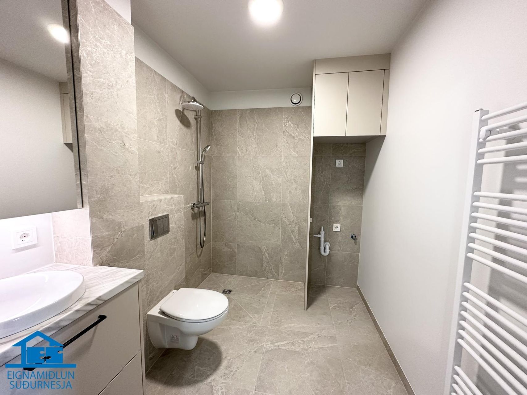 Baðherbergi: Hefur flísar á gólfi og veggjum að hluta, snyrtileg innrétting, upphengt salerni, sturta og handklæðaofn. Góð þvottaaðstaða með innréttingu fyrir þvottavél og þurrkara í vinnuhæð.