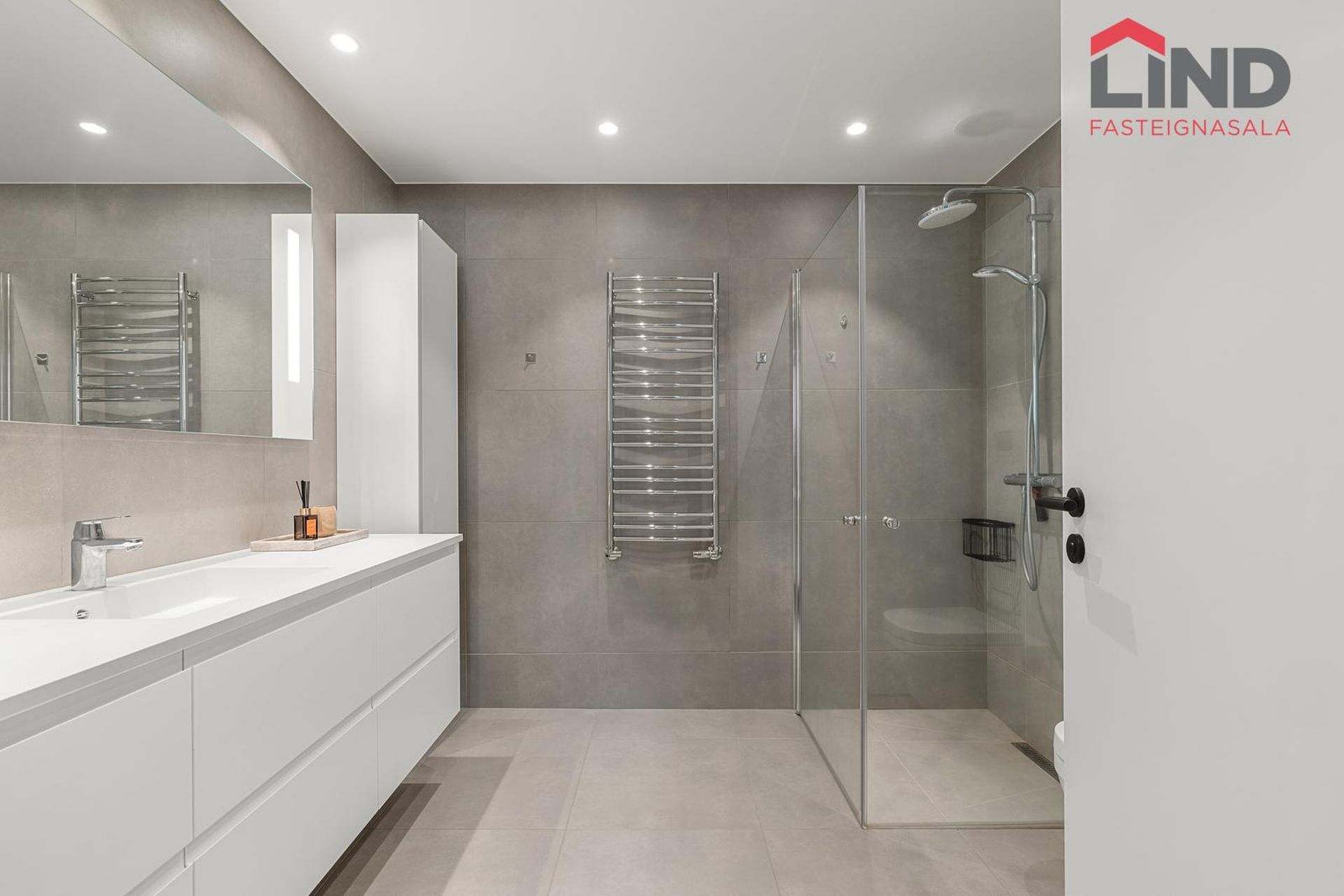 Baðherbergi: rúmgott, flísalagt hólf í gólf. Með hvítri upphengdri innréttingu með vaski og spegli með lýsingu fyrir ofan. Flísalögð sturta, handklæðaofn og upphengt salerni.
