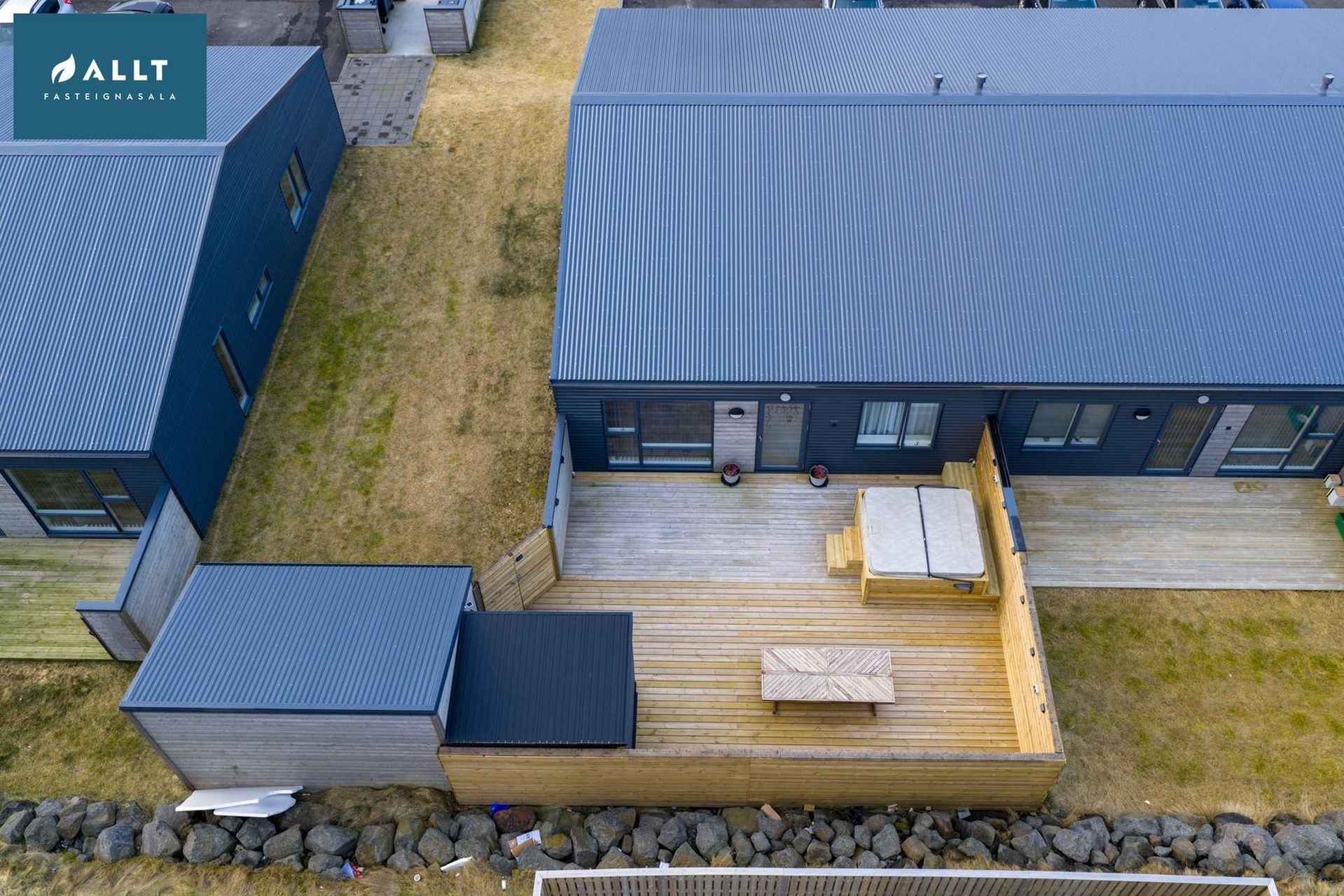 Lóðin er fullfrá gengin með aflokuðum stórum palli með heitum pott ásamt geymsluskúr sem í er rafmagn. Stéttir og bílastæði við aðkomuhlið íbúða eru hellulögð og snjóbræðsla í gangstéttum.