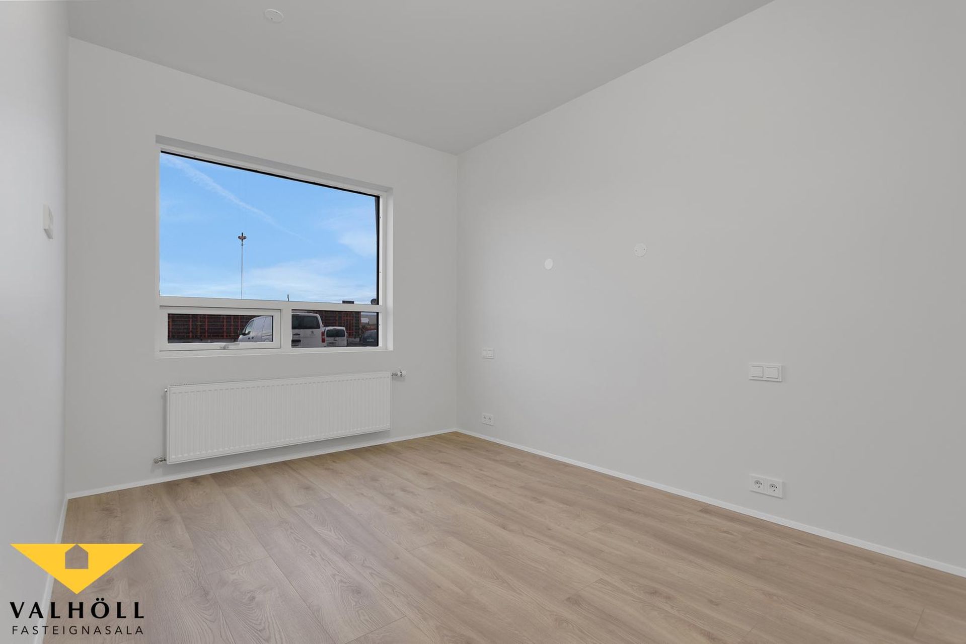 Svefnherbergi Herbergjum er skilað tilbúnum fyrir ljósatengingar, án gólfefna.