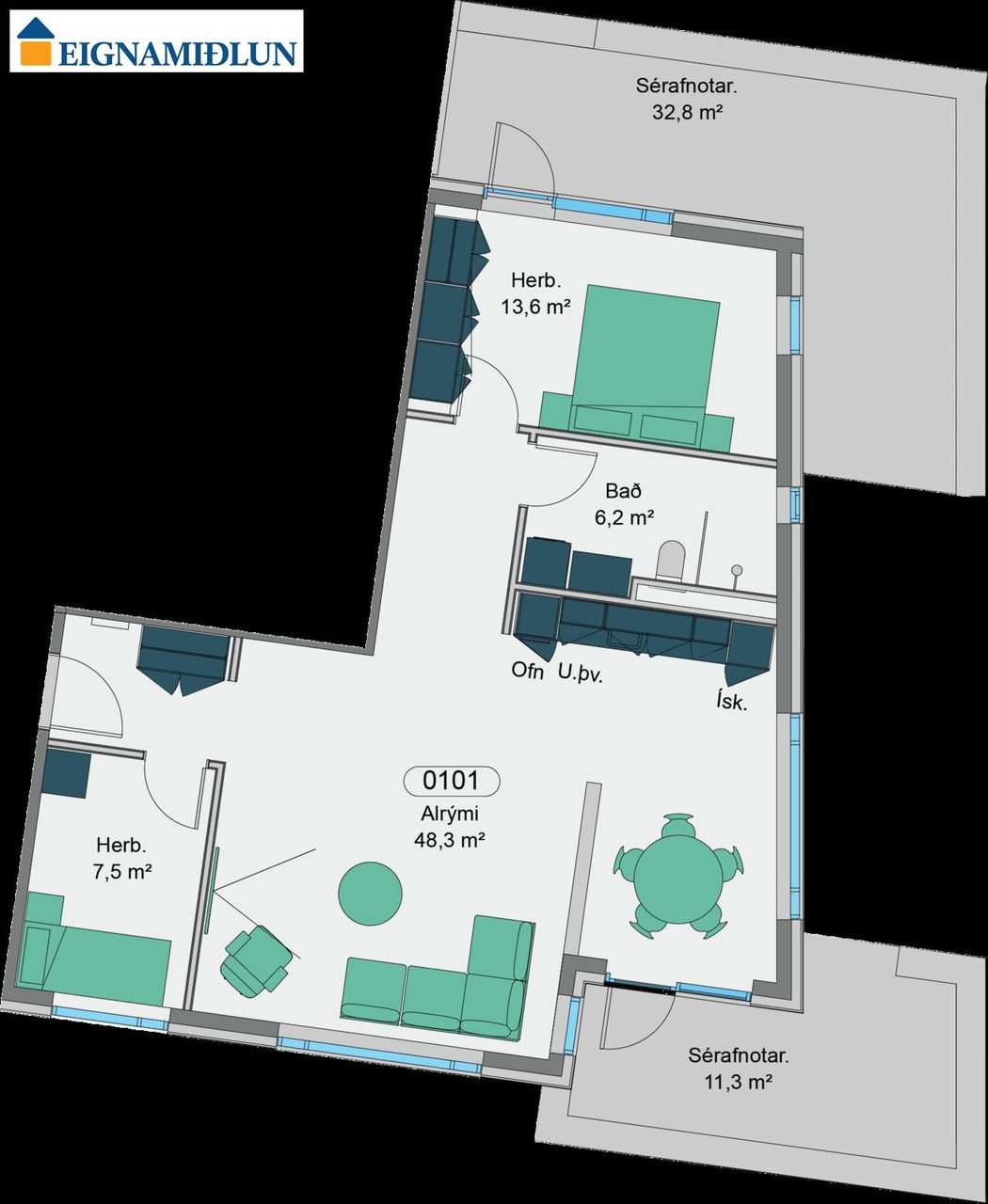 Íbúð merkt 01-01 er vönduð þriggja herbergja íbúð. Fastanúmer eignar: 252-1866. Birt flatarmál er 101.0 fm með tveimur sérafnotareitum og sérgeymslu í sameign. Tvö stæði fylgja íbúð í bílageymslu. Myndir eru af sýningaríbúð nr. 210.