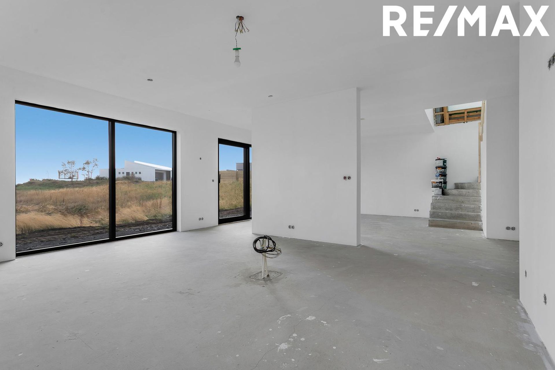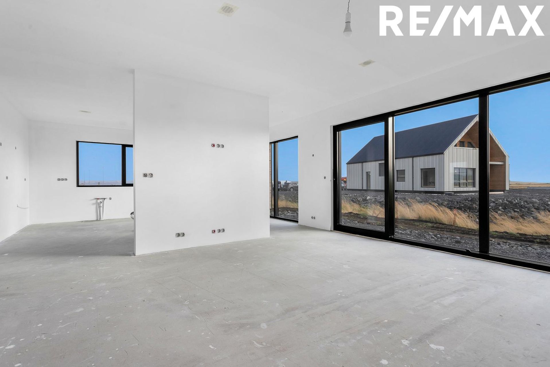 Veggir: Steyptir útveggir eru sandspartlaðir og grunnaðir að innan. Hlaðnir innveggir eru sandspartlaðir og grunnaðir. Handrið og handlistar innanhúss ekki innifalinn.