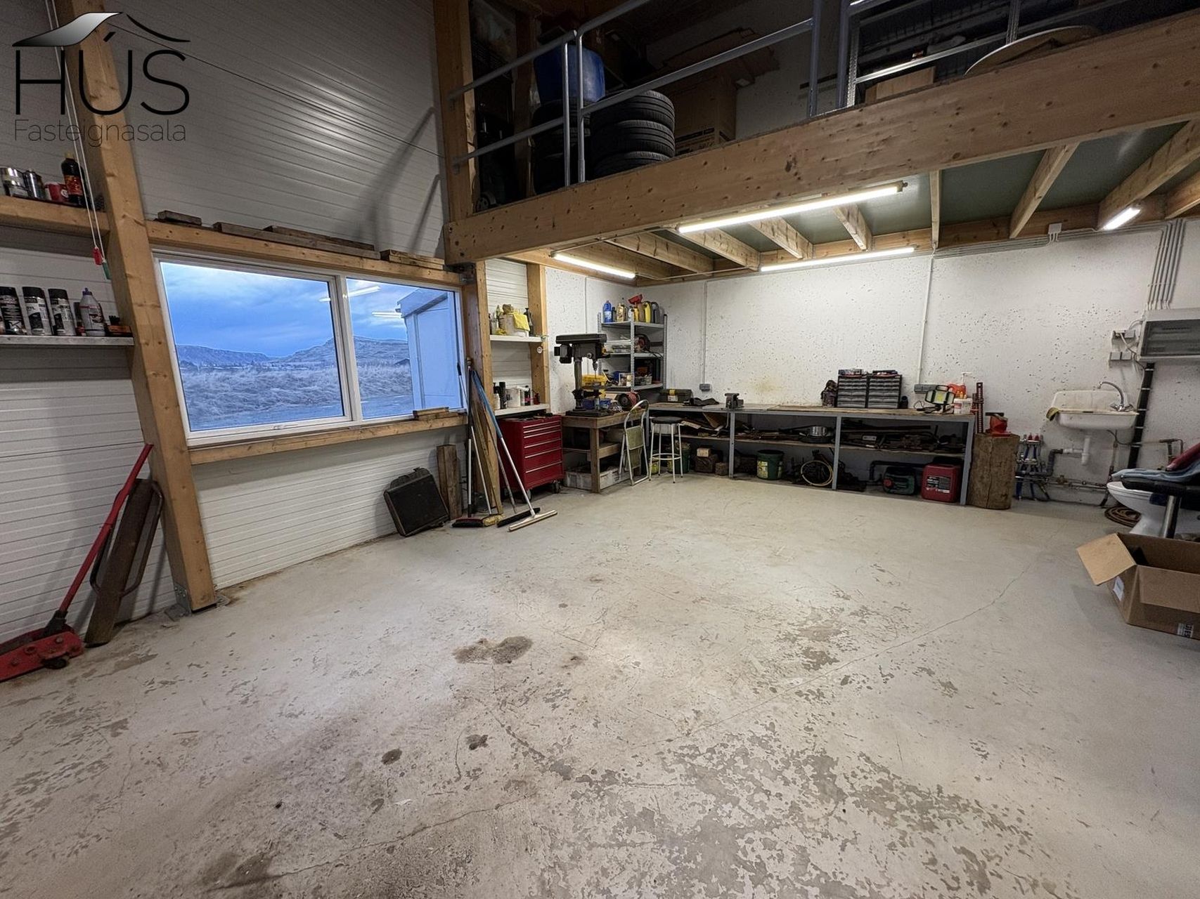 Gólf er vélslípað. Innkeyrsluhurð með rafmagnsopnara 3,0 m breið. Gönguhurð við hlið innkeyrsluhurðar. Gluggi á gafli. 3 fasa rafmagn. Góður stigi upp á ca. 18 fm milliloft.