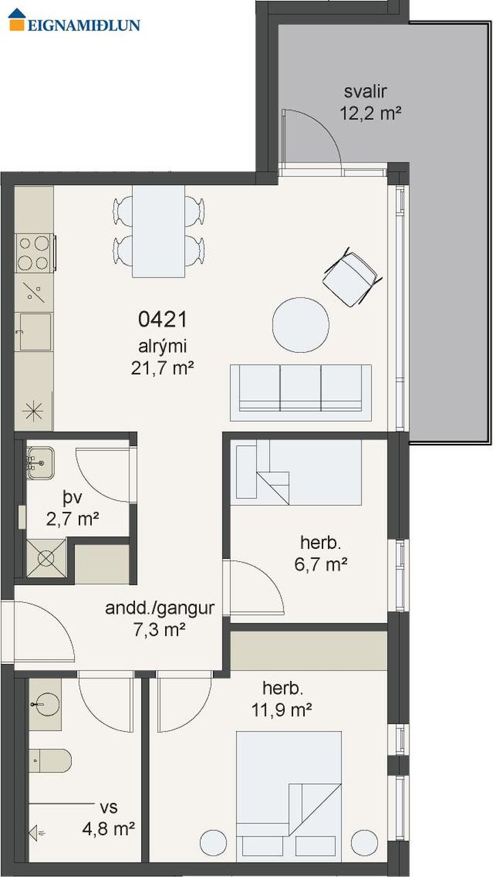 Nánar: Íbúð merkt 04-21 er með 2 svefnherbergjum,eldhúsi, stofu og baðherbergi. Tengi fyrir þvottavél og þurkara er á baði. Geymsla í sameign fylgir. Íbúðinni fylgir stæði í bílakjallara merkt B-093.