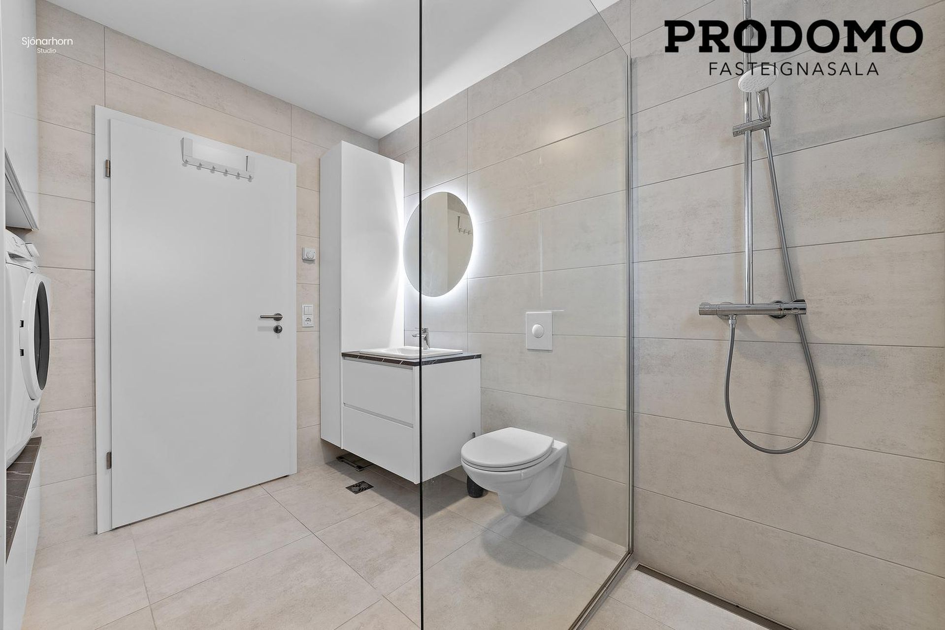 Baðherbergi hefur flísar á gólfi og veggjum, snyrtilega innréttingu, upphengd salerni og walk-in sturtu. Þvottaaðstaða er innan baðherbergis með innréttingu fyrir þvottavél og þurrkara í vinnuhæð.Gluggi er á baðherbergi.