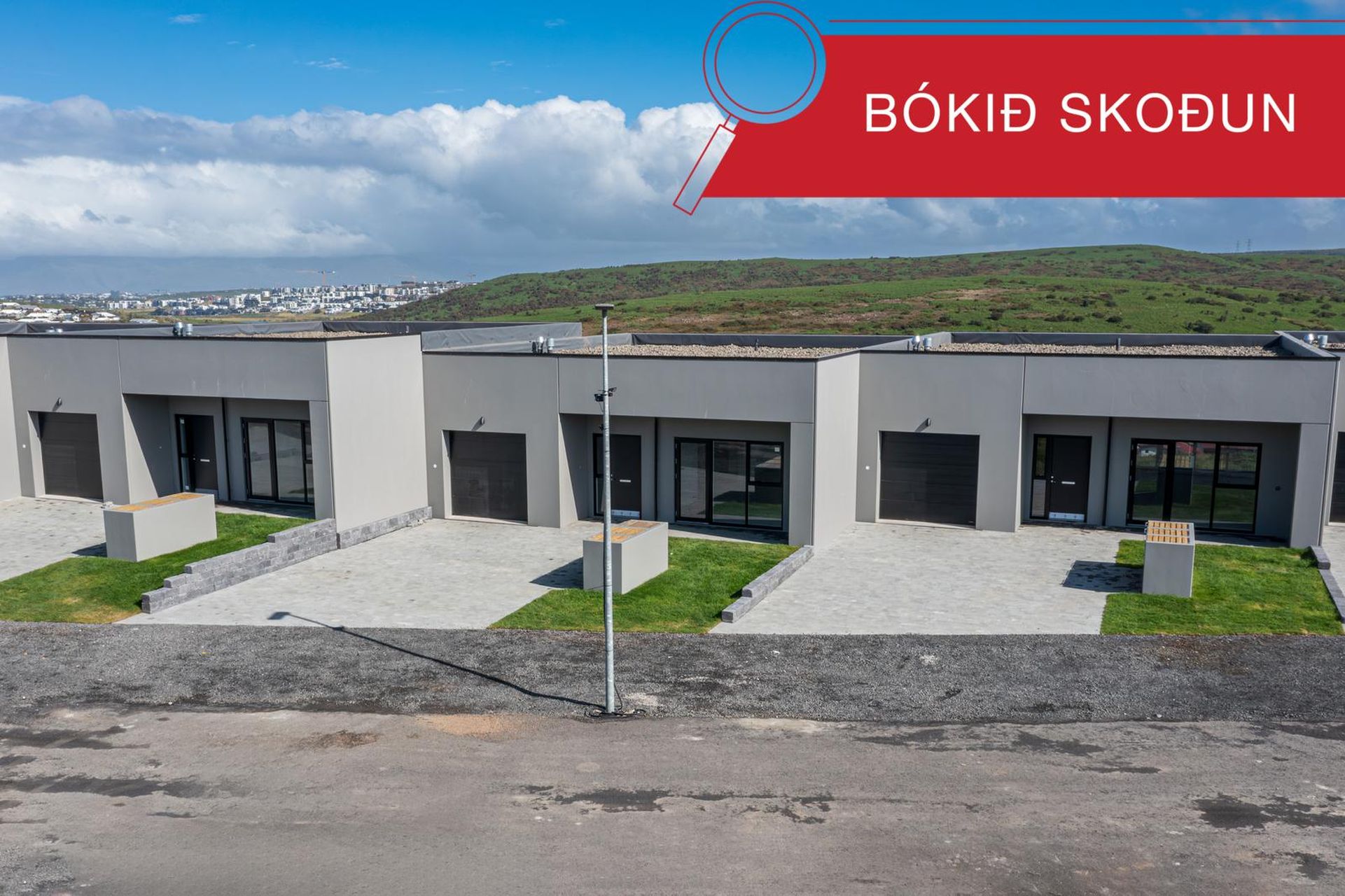 Að utan skilast hellulögð, með snjóbræðslu að hluta.