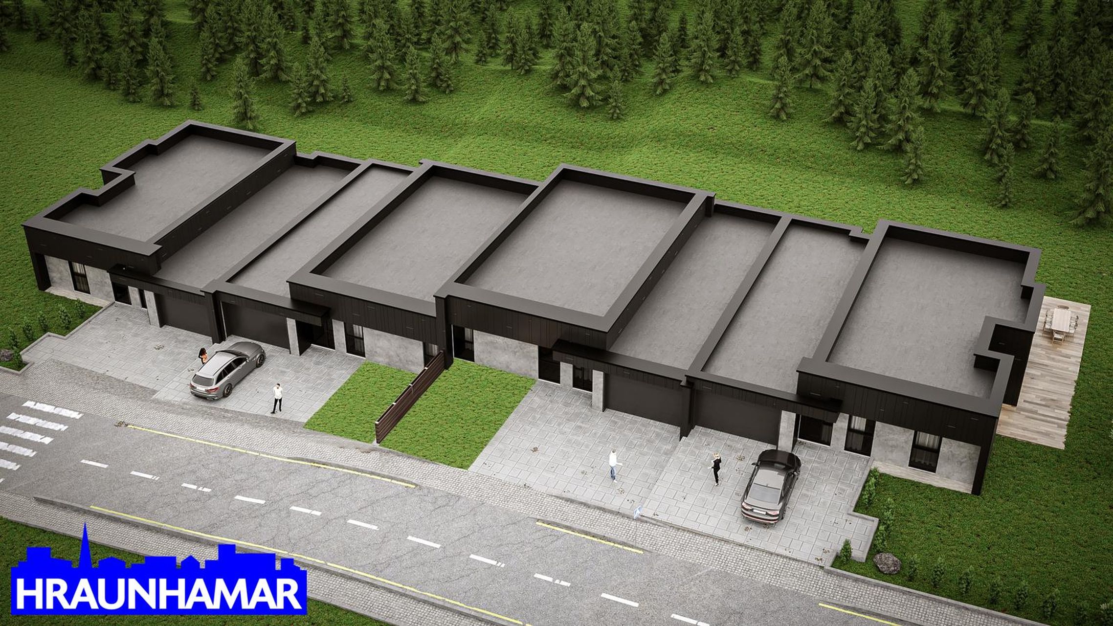 Hellulagt verður fyrir framan húsið í samræmi við teikningar. Timburverandir verða klæddar lerki (eða sambærilegt). Jarðvegur á lóð skilast grófjafnaður.