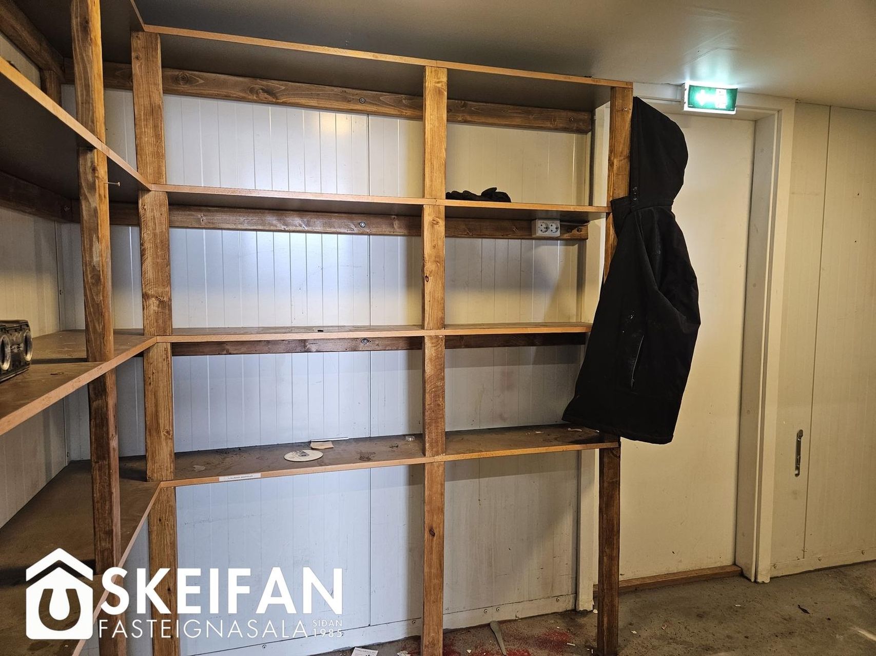 Á neðri hæð er salerni, skrifstofurými og geymslurými auk vinnurýmis, efri hæðina er búið að stúka af með 3 rýmum sem skiptast salerni með sturtu, gluggalaust rými auk skrifstofrýmis.
