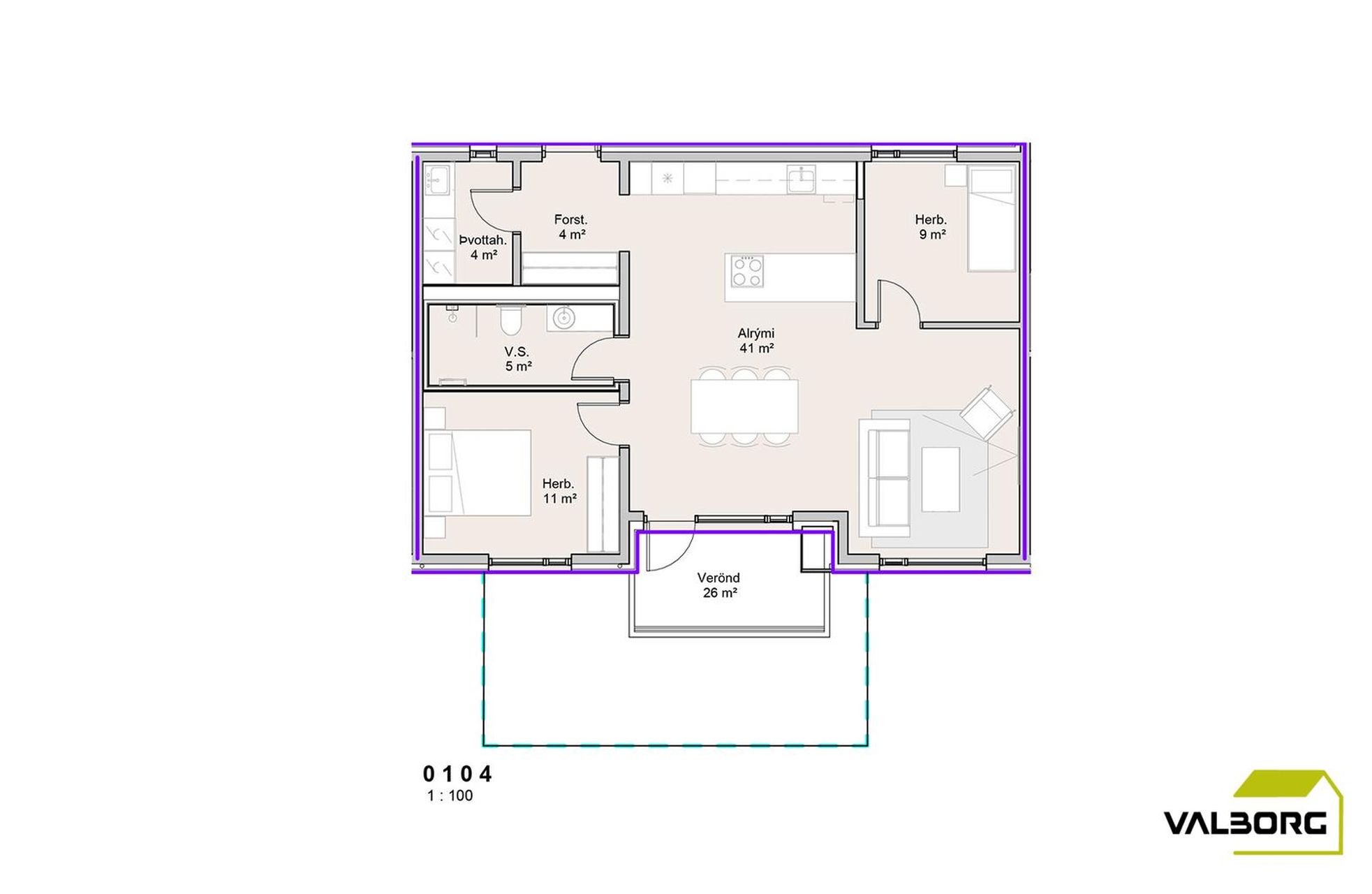 Eignin er 104,6m² að stærð og skiptist eftirfarandi: