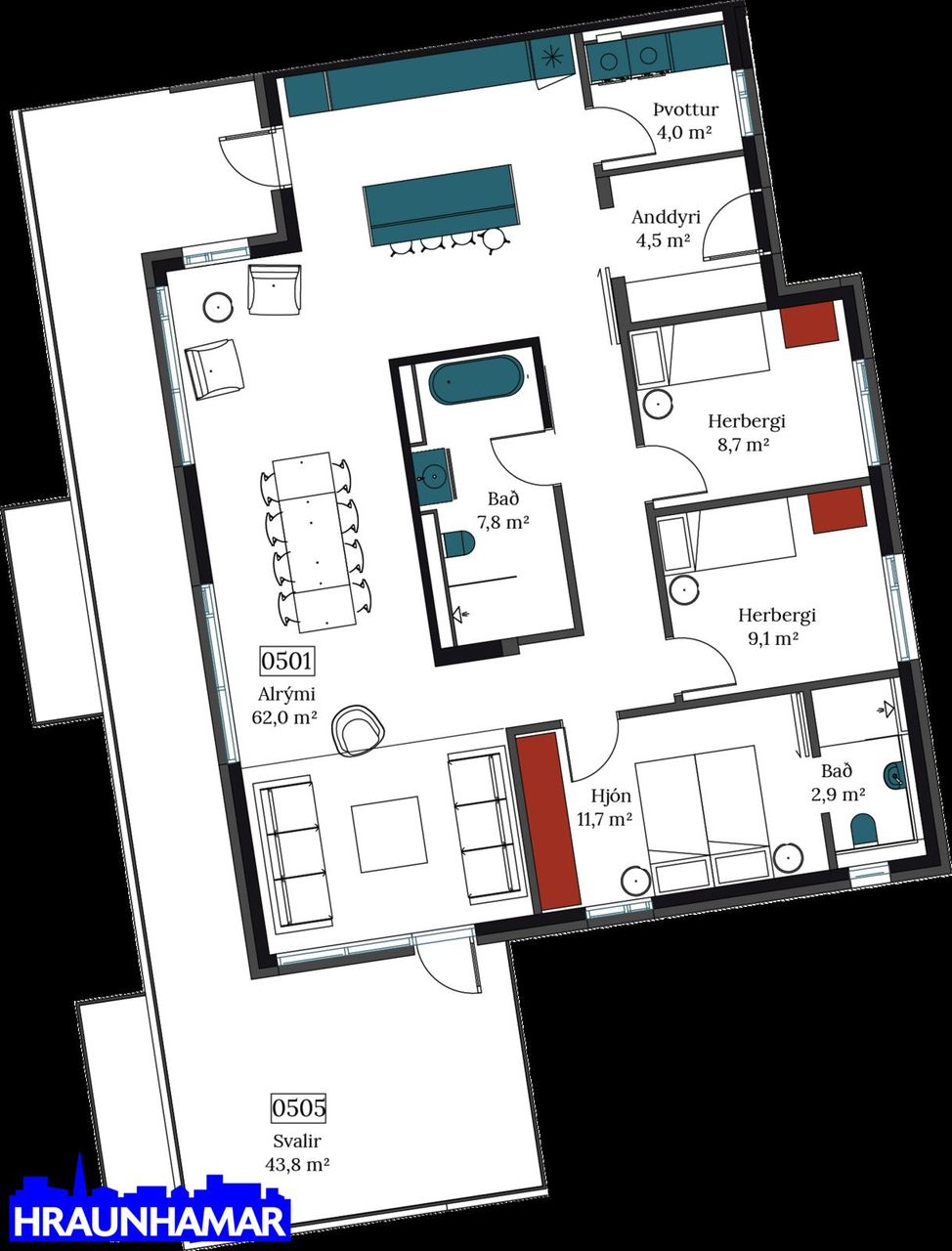 Íbúð 501 er fjögurra herbergja, skráð 137,4 fermetrar með geymslu. Auk þess fylgir stæði með í lokaðri bílageymslu.