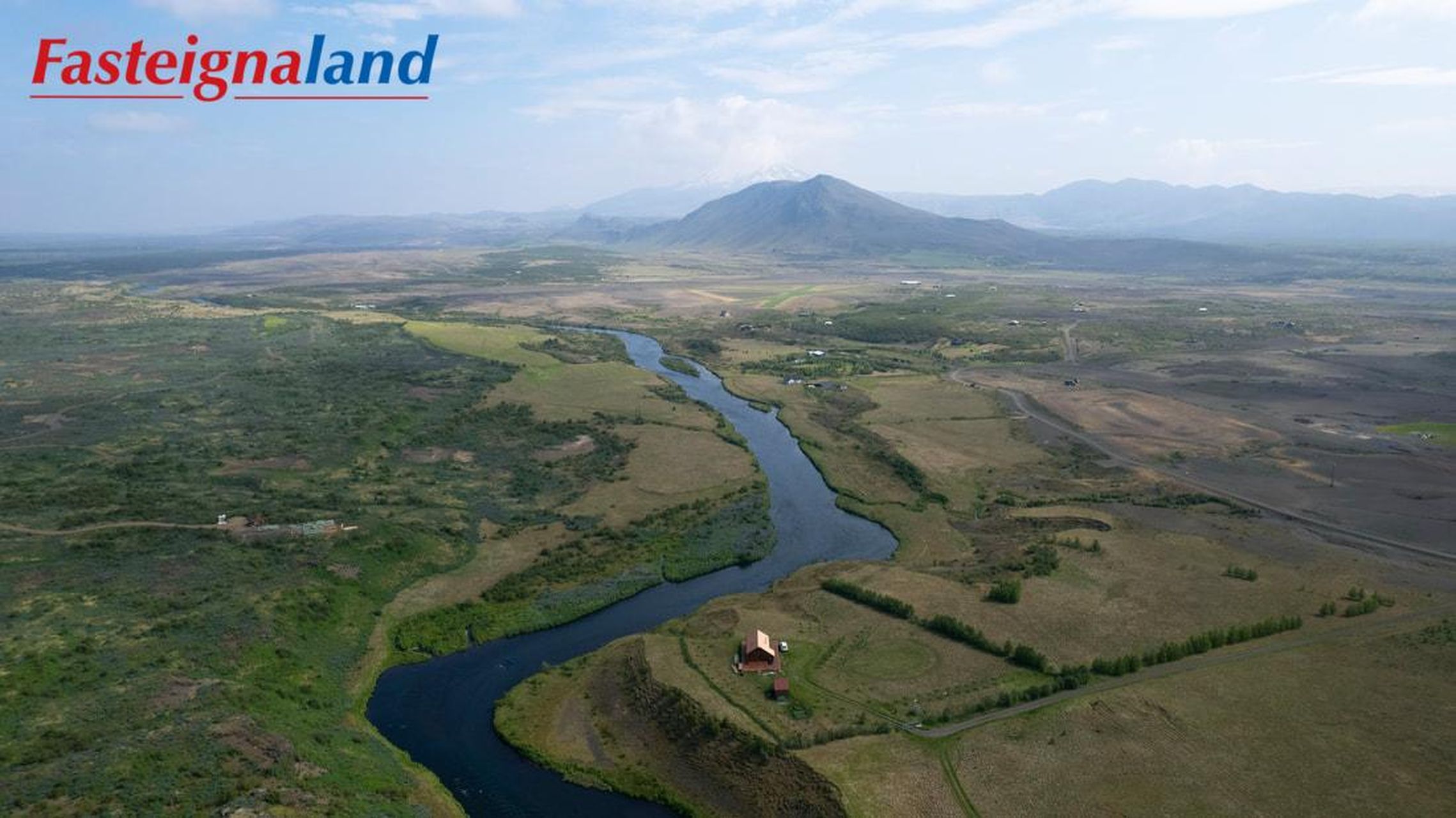 Hin tignarlega Hekla er áberandi í Fjallalandi og vel sést til Búrfells og Bjólfells sitthvoru megin