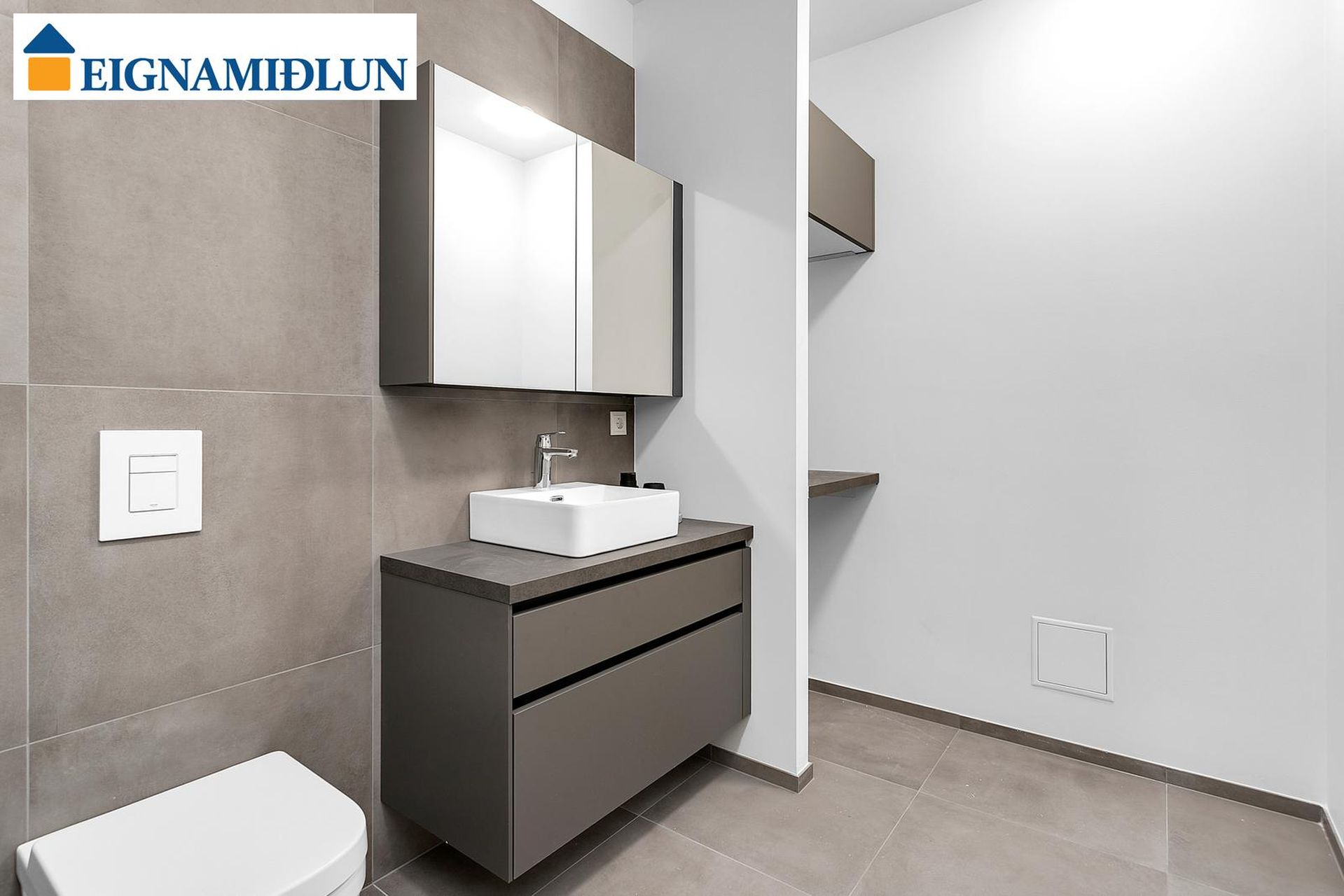 Baðherbergisgólf og sturturými eru flísalögð. Baðherbergisveggir eru spartlaðir og málaðir með rakaþolinni málningu á þeim veggjum sem ekki eru flísalagðir. Baðinnrétting er með neðri skáp, hvítri handlaug og efri skápum með spegli á hurðum og ljósi. Salerni er vegghengt með innbyggðum vatnskassa. Blöndunartæki á baði eru hitastýrð blöndunartæki og sturtustöng með utanáliggjandi blöndunartækjum. Lýsing er í lofti á baðherbergjum. Vandað harðparket er á alrýmum. Sjá nánar í skilalýsingu. Innréttingar í þessari íbúð eru: Dökk Concrete Terra