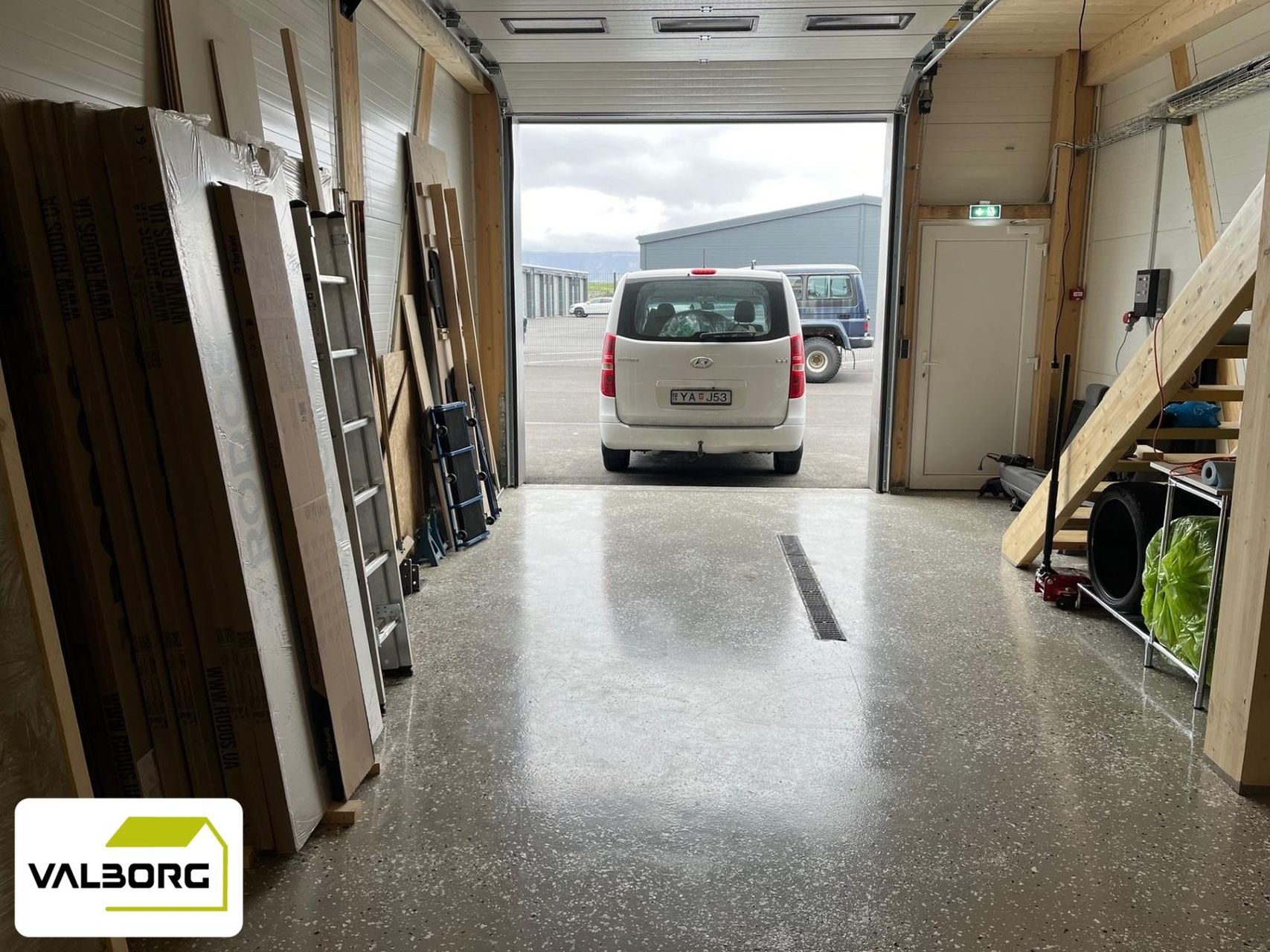 - Innkeyrsluhurð 3x3m með rafmagnsmótor, gönguhurð við hlið innkeyrsluhurðar.