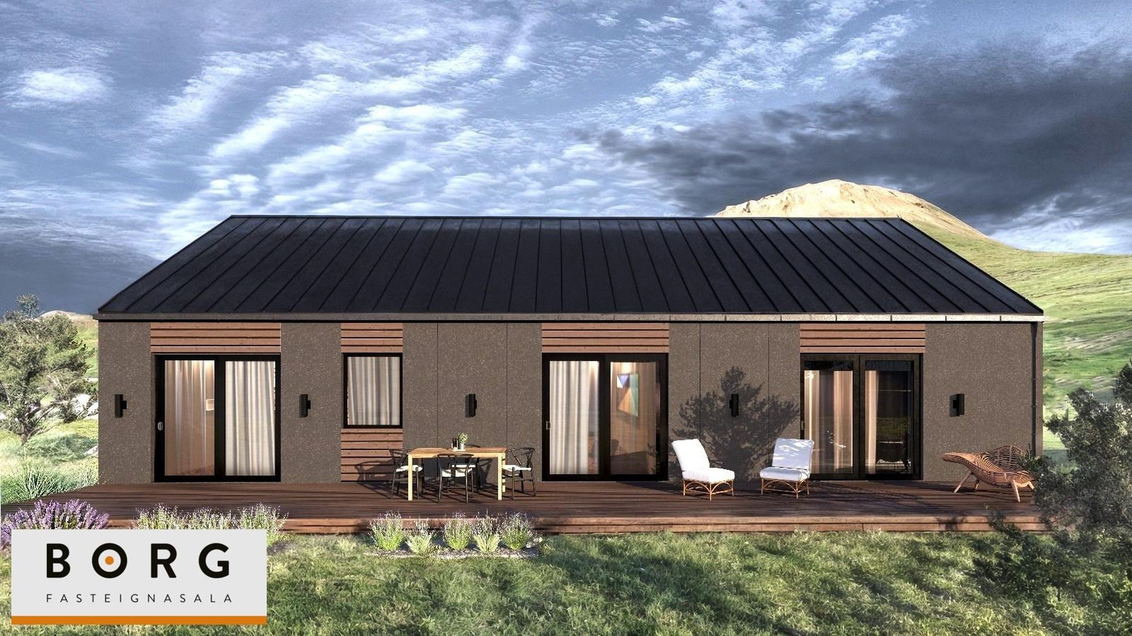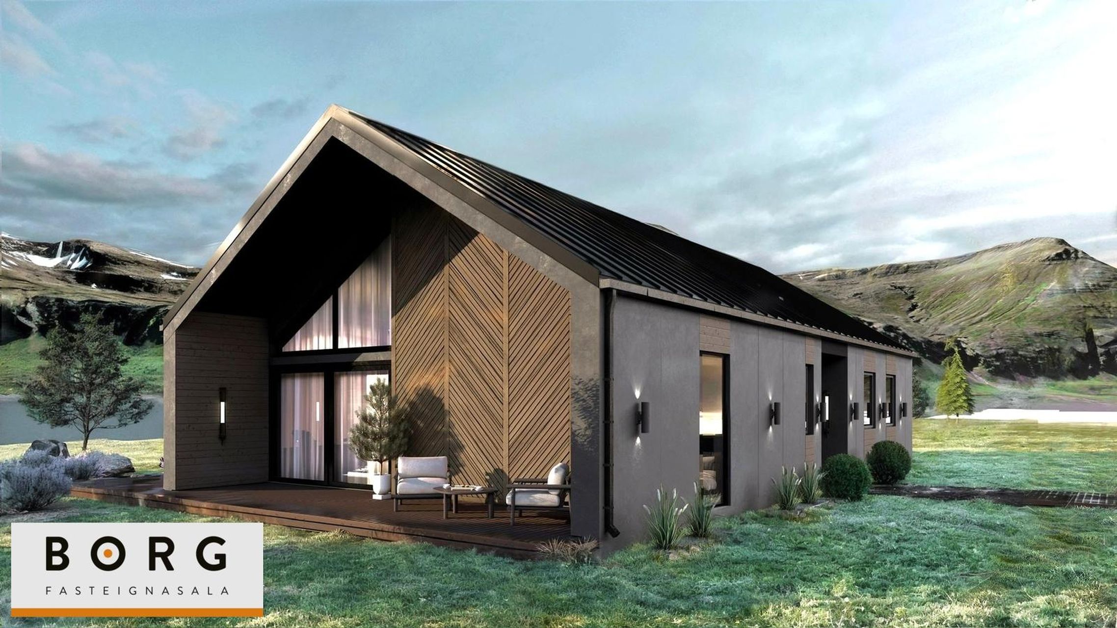 Að utan er eignin fallega klædd með sementstrefjaplötum og viðarklæðningu ásamt ytri lýsingu sem mun fegra heimilið hvort sem er að degi til að eftir að dimma tekur. Þakið er vel einangrað og þar er efnisval sérlega valið með gæði og endingu í huga, timbur með málm klæðningu. Gluggar og hurðir eru úr timbri af góðum gæðum.