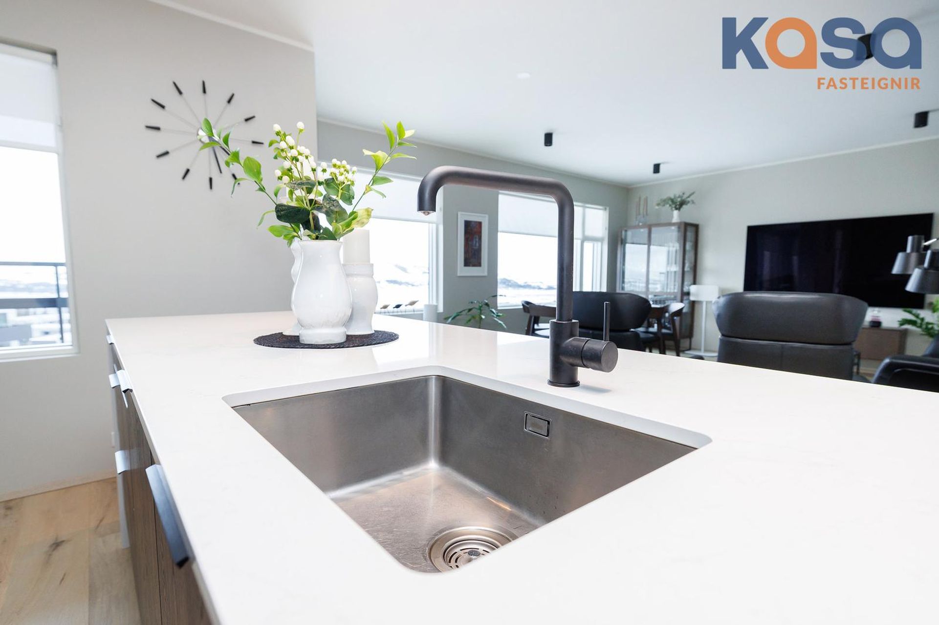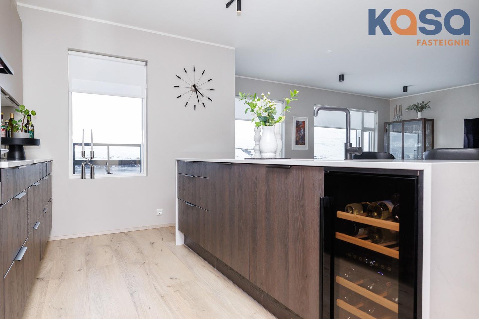 Eldhús: Innrétting með góðu skápa og skúffuplássi. Innbyggður ísskápur og uppþvottavél er í innréttingu ásamt bakaraofni og combi ofni. Span helluborð er fræst í borðplötuna sem eru úr quartz stein, veggur á milli bekkjar og efriskápa er einnig klæddur með quartz.. Rúmgóð eyja er við eldhúsið, þar eru skúffur og vínkælir. Eyjan er klædd quartz stein og er með undirlímdum vaski. Gott pláss er við eyjuna. Öll tæki eru mjög vönduð Siemens tæki úr extraKlasse línunni.