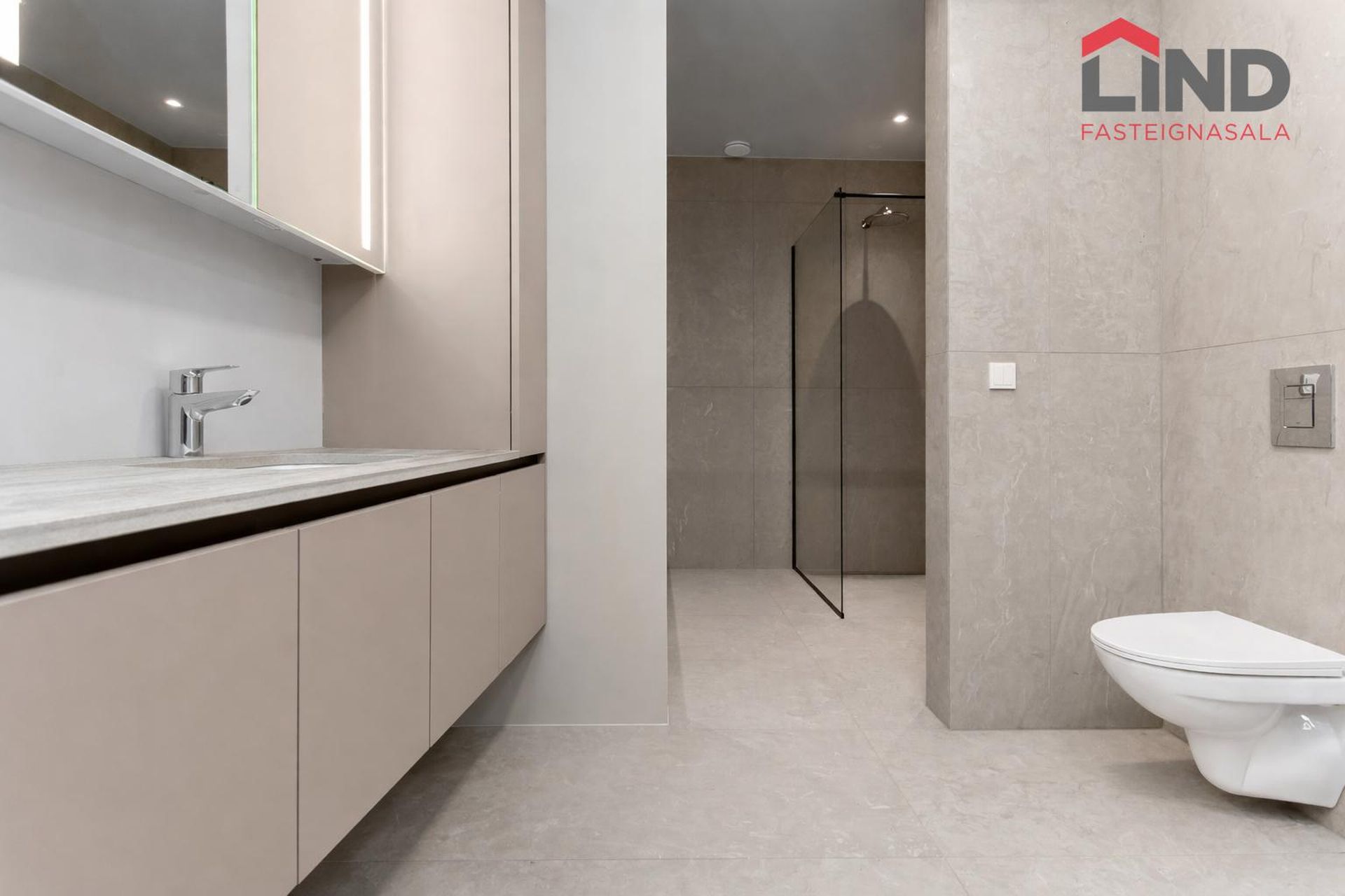Snyrting: Flísar á gólfi og vegg að hluta. Upphengt salerni. Innrétting frá Selós, matt beige að lit. Borðplata úr Dekton stein.