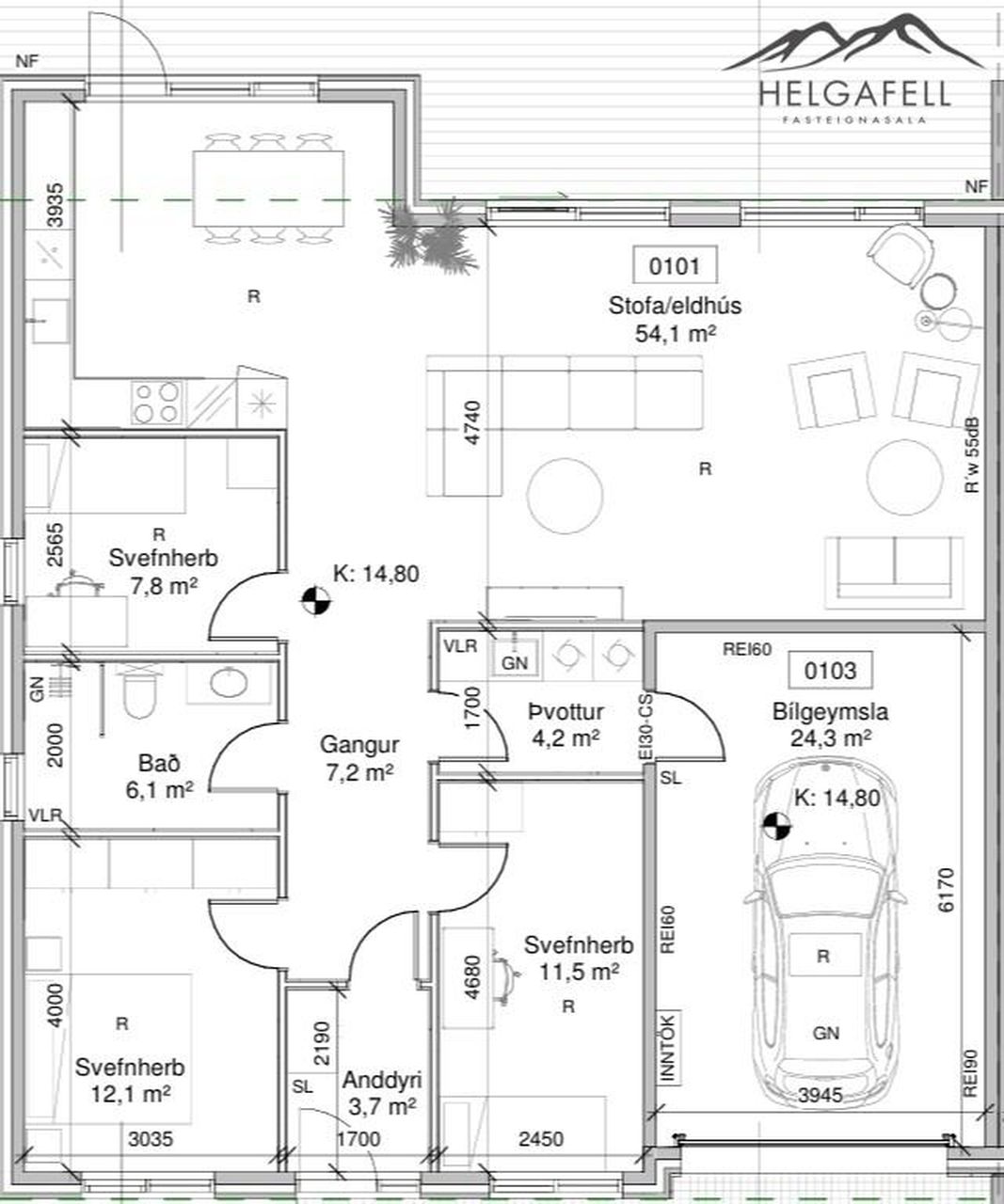 Innveggir: Innveggir eru 120 mm hefðbundnir gifsveggir og burðarveggir eru steyptir.