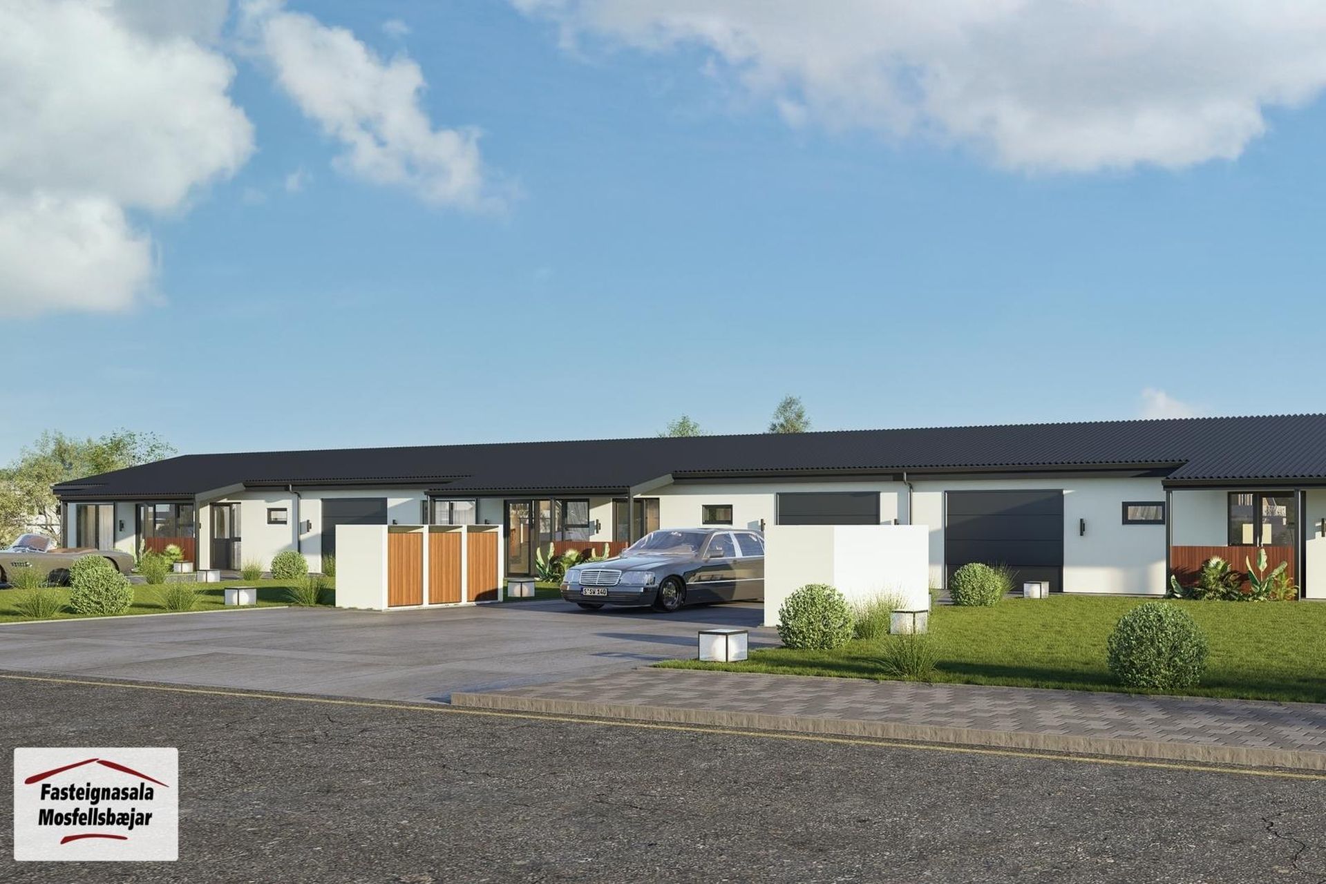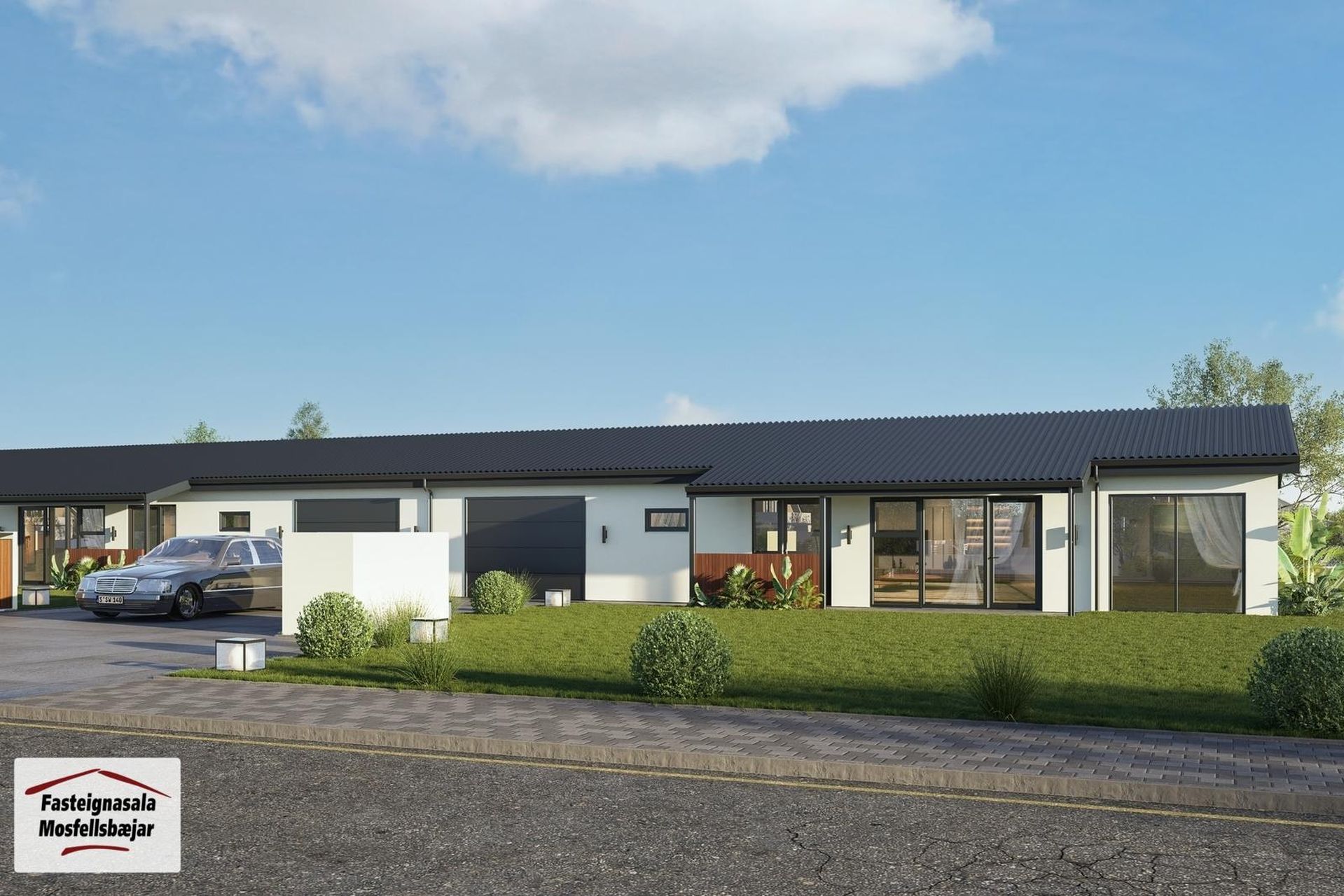 Utanhúss: Raðhús á einni hæð með bílskúr byggt úr forsteyptum einingum frá Steypustöðinni.