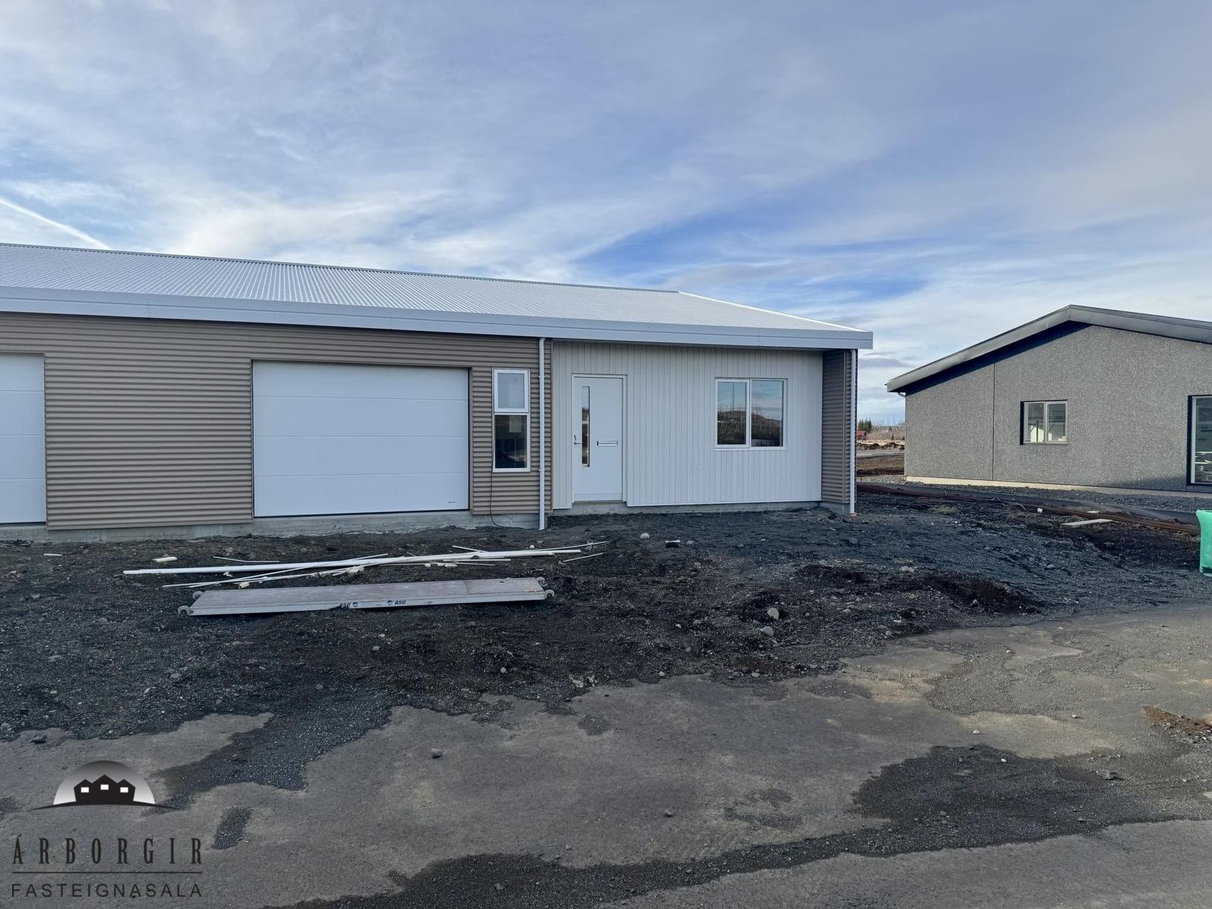 Húsið er timburhús klætt að utan með lituðu báruáli lituðu timbri í bland og járn á þaki. Gluggar og hurðir eru ál/tré, þakkantur er klæddur með lituðu áli.