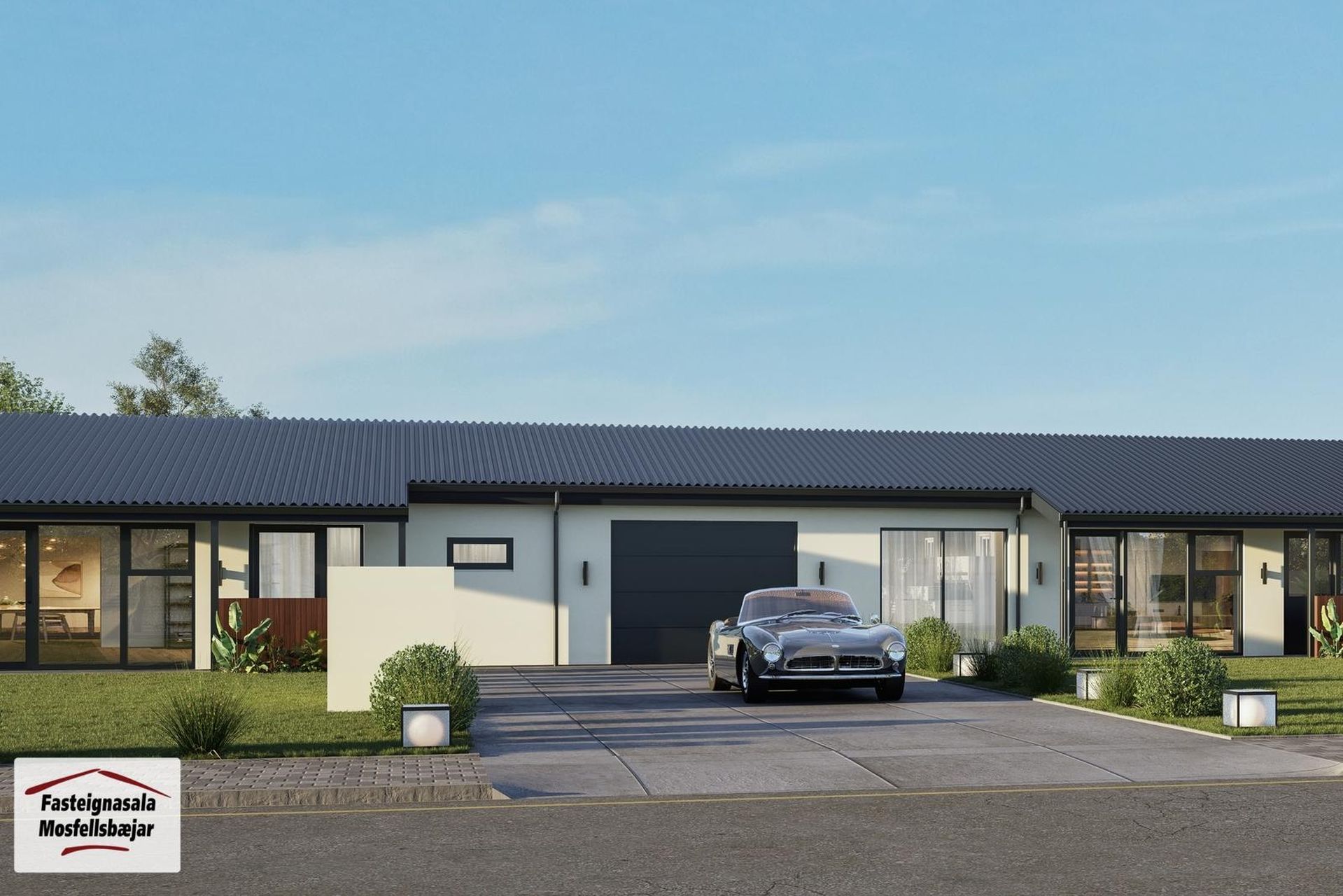 Utanhúss: Raðhús á einni hæð með bílskúr byggt úr forsteyptum einingum frá Steypustöðinni.