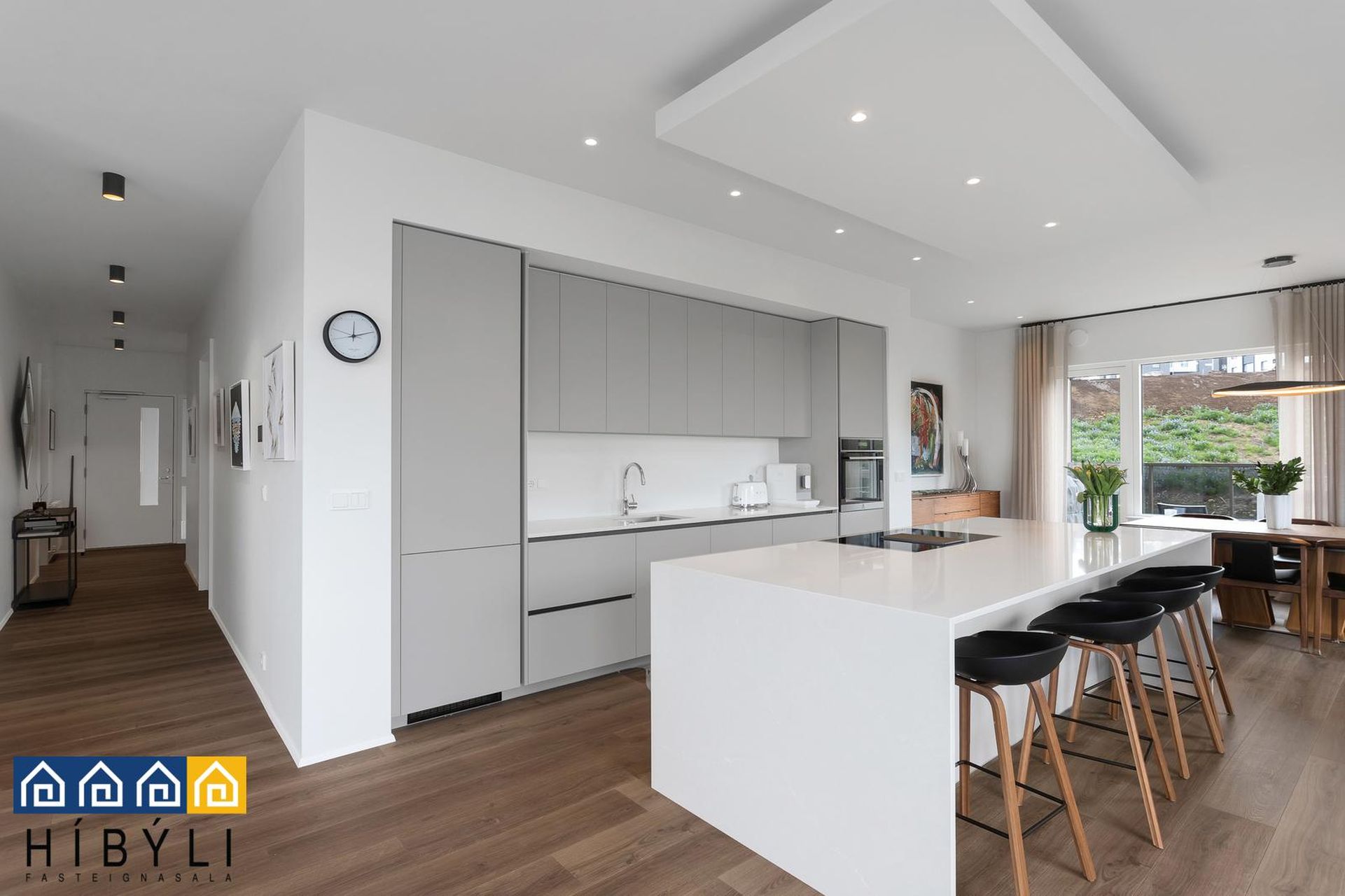 Eldhús: Ljósgrá innrétting með miklu skápa og vinnuplássi, eldunareyja sem unnt er að sitja við, quartz borðplötur, innfelld tæki, loft niðurtekin að hluta með innfelldri lýsingu.