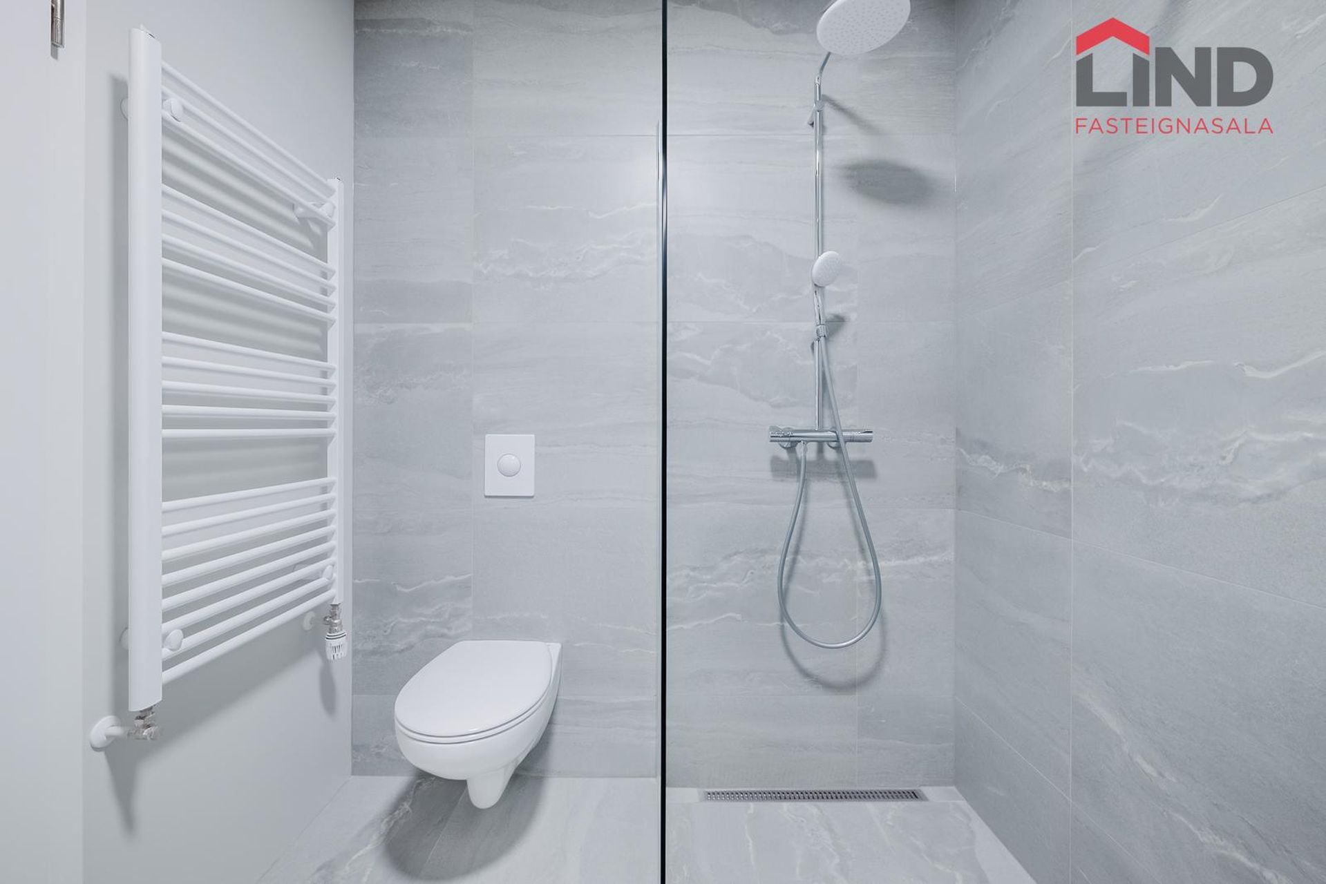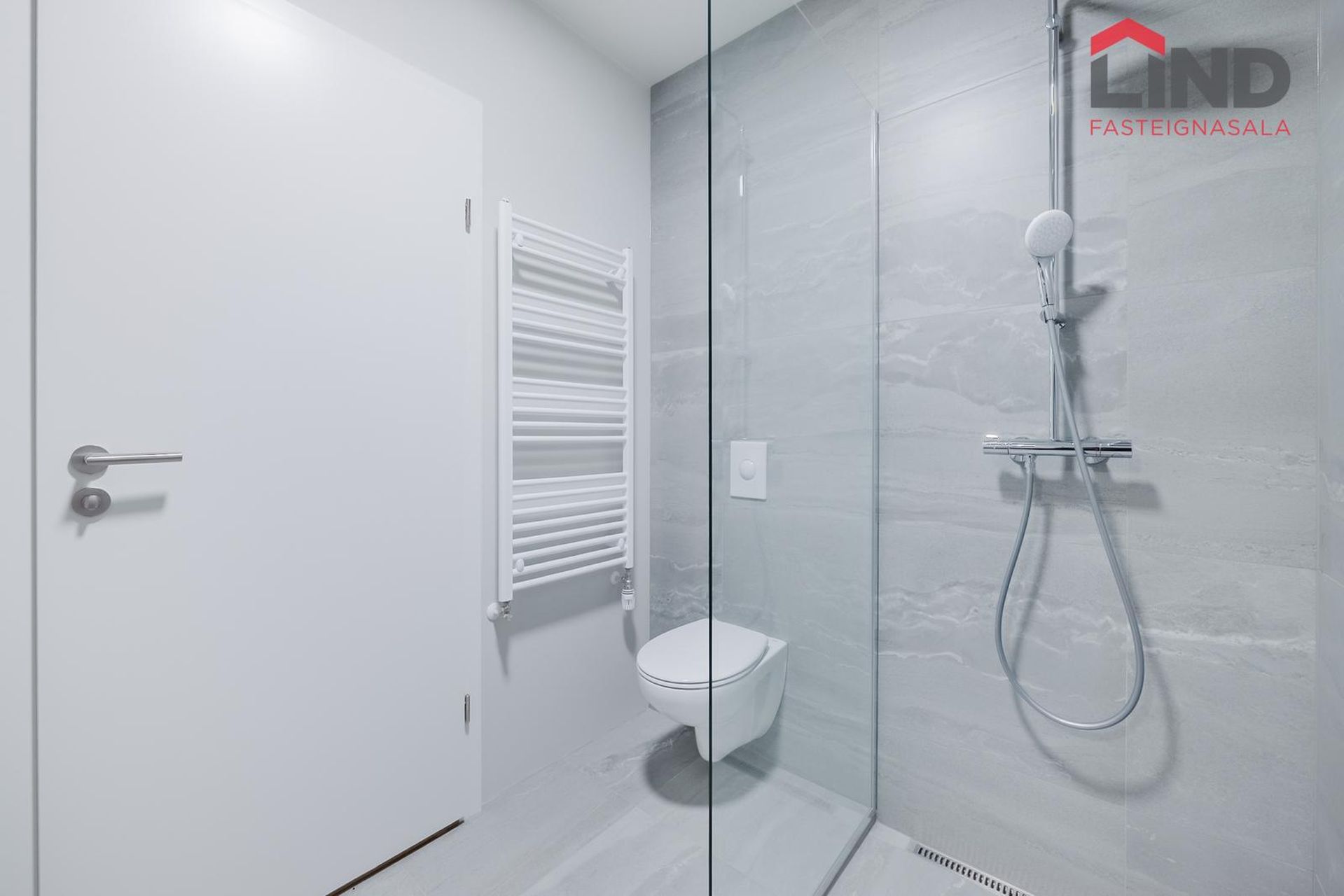 Baðherbergi: Baðinnrétting kemur frá Axis. Hreinlætistæki og handklæðaofn eru frá Byko. Salernið er upphengt og innbyggt. Hitastýrð blöndunartæki verða við sturtu. Gólf eru flísalögð og veggir að hluta upp í loft