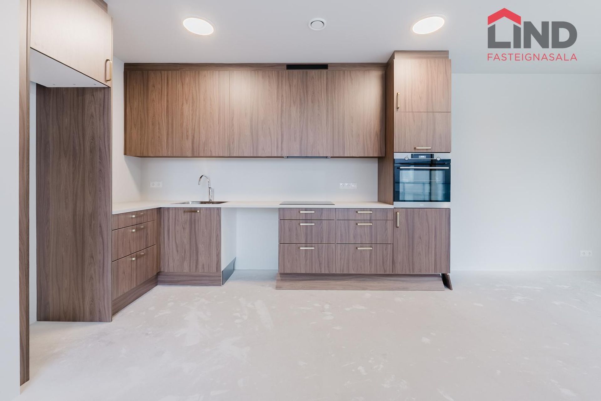 Eldhúsinnrétting er sérsmíðuð af vandaðri gerð frá Axis ásamt vaski og Grohe blöndunartækjum frá Byko. Helluborð og blástursofn eru af gerðinni AEG frá Ormsson (sjá nánar á www.ormsson.is) Gufugleypir í eldhúsi er einnig frá Ormsson.
