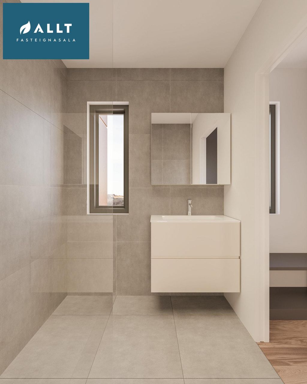 Baðherbergi 2: Á aðal baðherbergi eru flísar frá Flísabúðinni á gólfi og veggjum, innrétting frá GKS. Handlaugarskál með hitastýrðu blöndunartæki, upphengt og innbyggt salerni með hæglokandi setu. Sturta skilast með innbyggðum blöndunartækjum og sturtuhlið úr gleri.