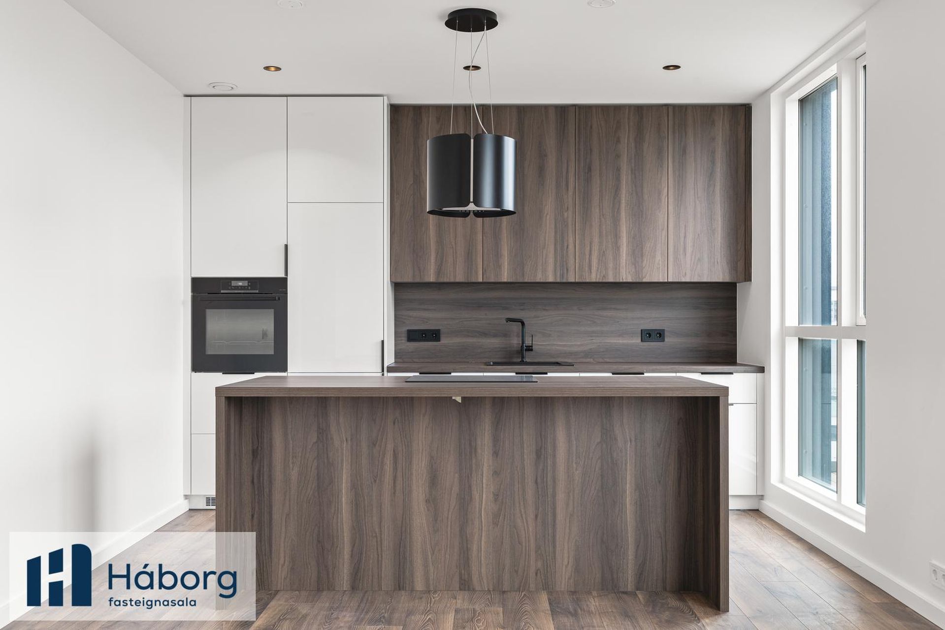 Nánar um íbúðina: þegar komið er inn í íbúðina er góður forstofuskápur. Á hægri hönd er herbergi með góðum skápum. Á vinstri hönd úr forstofu er sér þvottahús sem er innréttað með góðri vinnuaðstöðu. Úr forstofu er komið inn í hol en þar blasir við glæsilegt alrými, eldhús með eyju sem hægt er að sitja við og glæsilegar rúmgóðar bjartar stofur með útgengi á svalir. Baðherbergið er með góðri snyrtiaðstöðu, innbyggðum blöndunartækjum sturta og handlaug með skúffum undir og spegill fyrir ofan. Hjónaherbergið með fataherbergi innaf og með útgengt út á svalir úr herbeginu. Eigninni fylgir geymsla í kjallara stærð 8,3 fm. Aðgengi að bílakjallara á 3.hæðum.