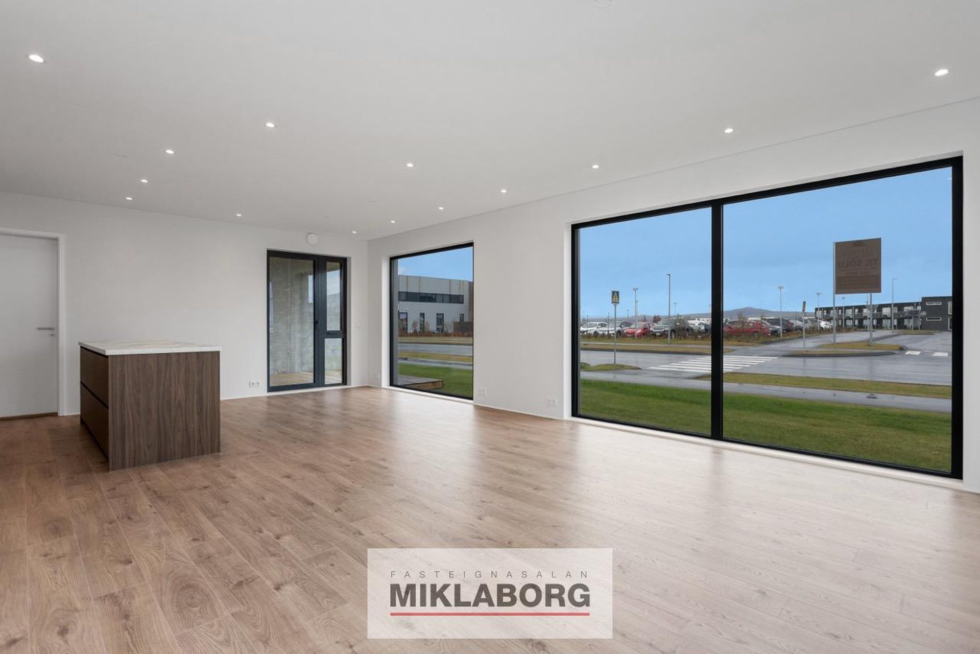 Miklaborg kynnir: Glæsileg 132,5 fm 4ra herbergja íbúð á neðri hæð í fjórbýli með sérinngangi, vel skipulögð, aukin lofthæð, hljóðdúkur í lofti, innfelld lýsing, vandaðar innéttingar frá Voke3. Afhendist fullbúið með gólfefnum, hiti í gólfi. Um er að ræða nýbyggt fjórbýli sem er tilbúið til afhendingar. Húsið er staðsteypt og klætt að utan með litaðri álklæðningu, gluggar og hurðir eru úr áli og þak klætt með tvöföldum tjörudúk.