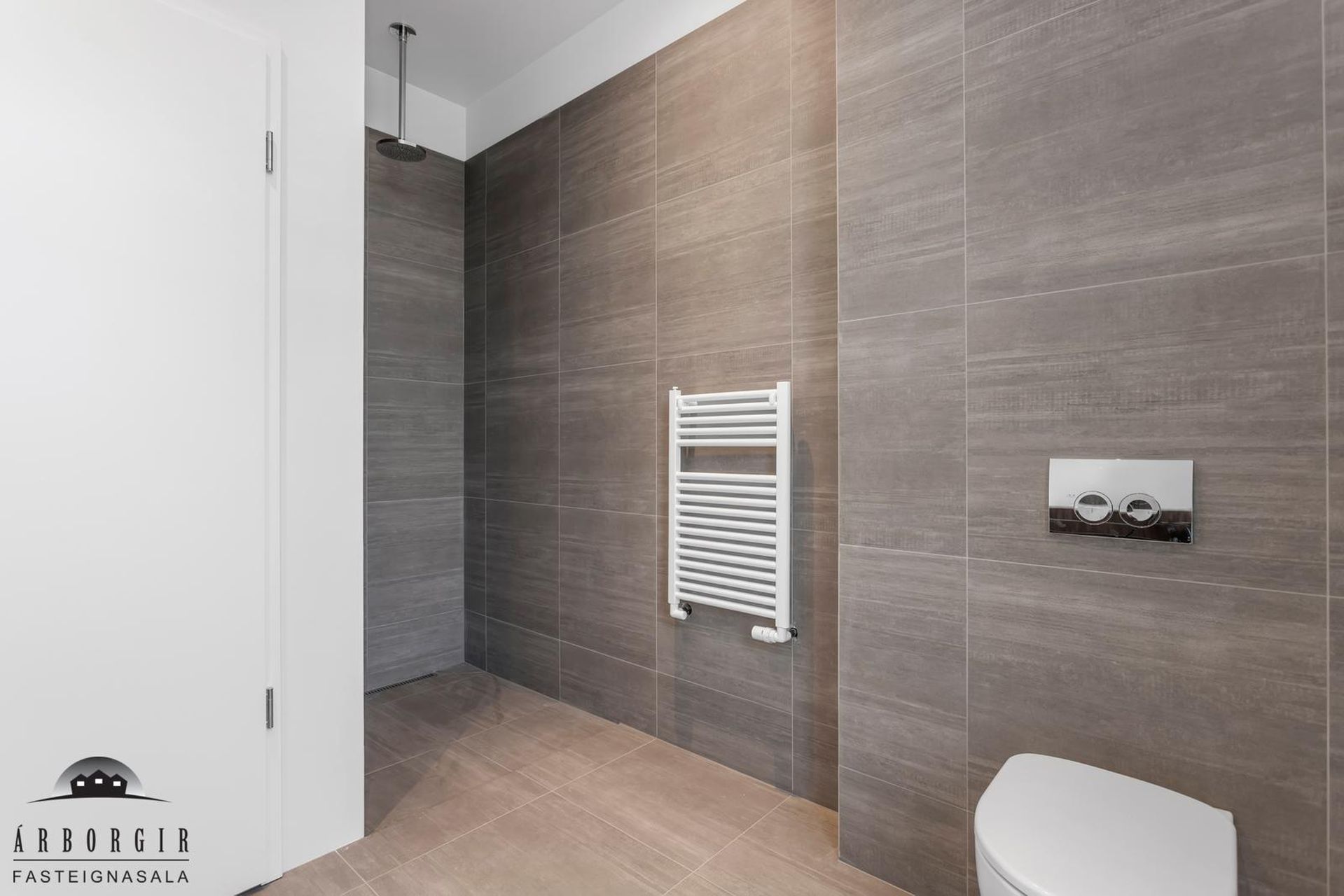 Baðherbergi er flísalagt bæði gólf og hluti veggja en þar er stór gólfsturta með innbyggðum tækjum og falleg innrétting.